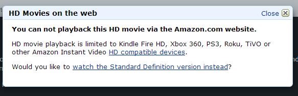 -Lots of movies not available in HD on computer to watch but yet I can watch TV shows in HD ?!?! – Why can’t I watch movies in HD? I can watch TV shows in HD but not movies?! Really that makes no sense at all. I can do it on Netflix, but apparently Amazon doesn’t want you to watch HD on your computer and they only want you to use another device.