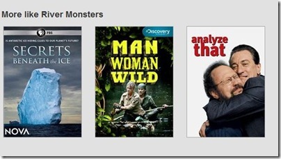 -Suggestion system is weird at times – Really? What does Analyze That have to do with River Monsters or any nature style documentary?! Nothing at all… This is a constant thing that makes no sense at all. This goes for both the ‘More Like’ and the ‘Because you watched’ sections. Right now it says ‘Because you watched Star Trek: the next Generation’ and there are things listed like Frasier, and Murder She Wrote, Cheers and Keeping Up Appearances (a goofy BBC show about a woman and her husband). To me none of those have nothing at all to do with Star Trek… but I could be wrong…