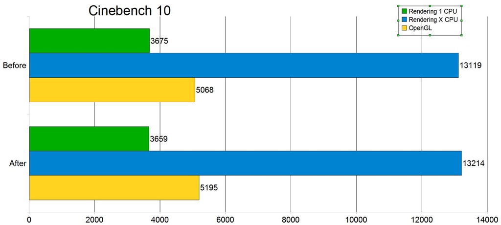 Rendering with Multiple CPUs seems to have gotten slightly better, but rendering with one CPU and in the OpenGL test we see lower scores for some reason.