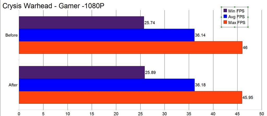The next test is Crysis Warhead with Gamer settings of 1920×1080 resolution, DirectX10 and 8xAA.