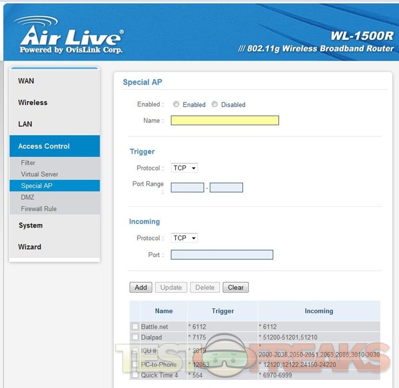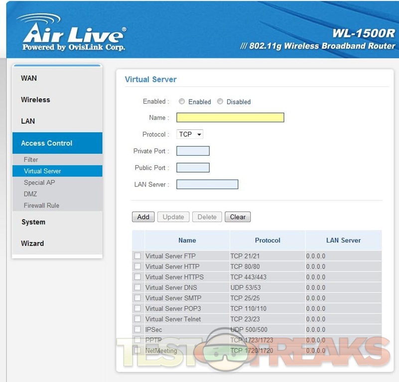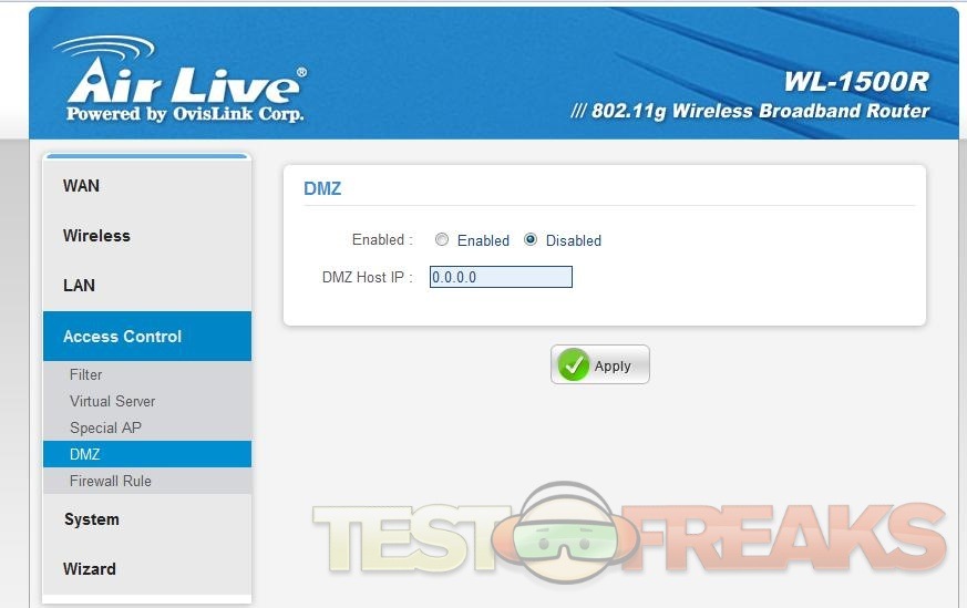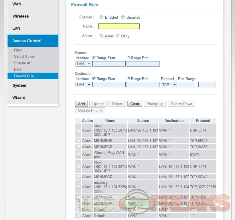 The next menu option would be Access Control, and it’s just what it sounds like, here you can adjust the access settings of your router for you network. The sub menus are Filter, Virtual Server, Special AP, DMZ and Firewall Rule, these are all pretty much self explanatory really.