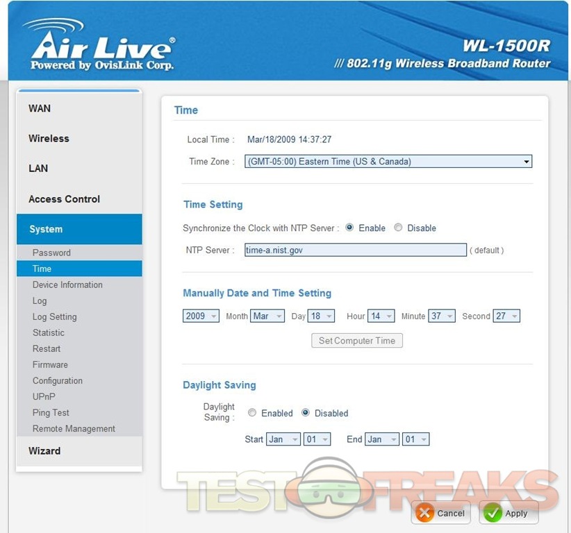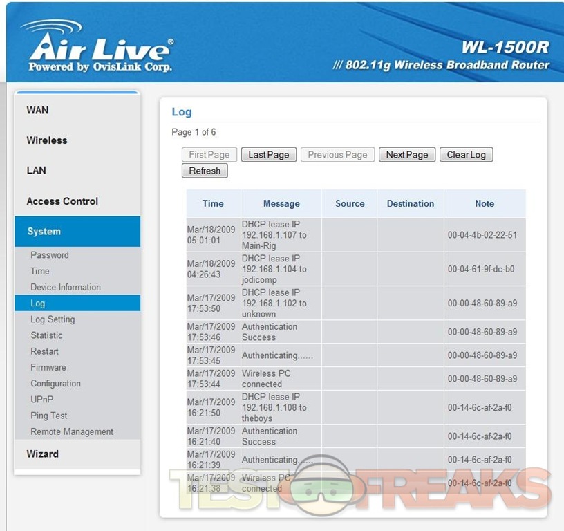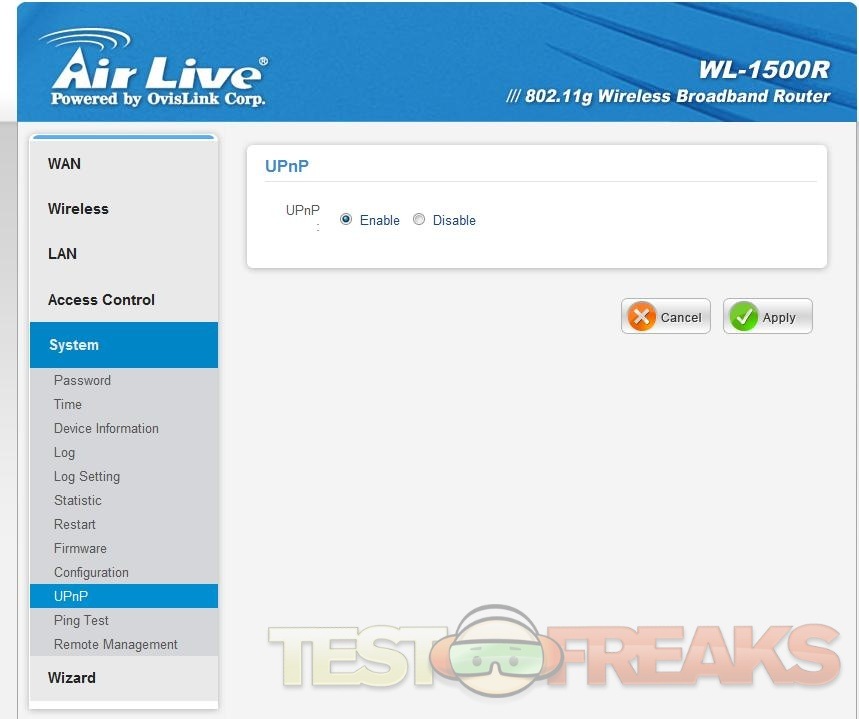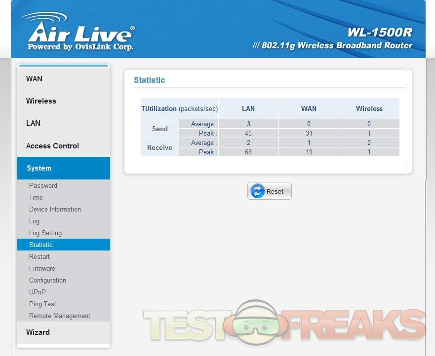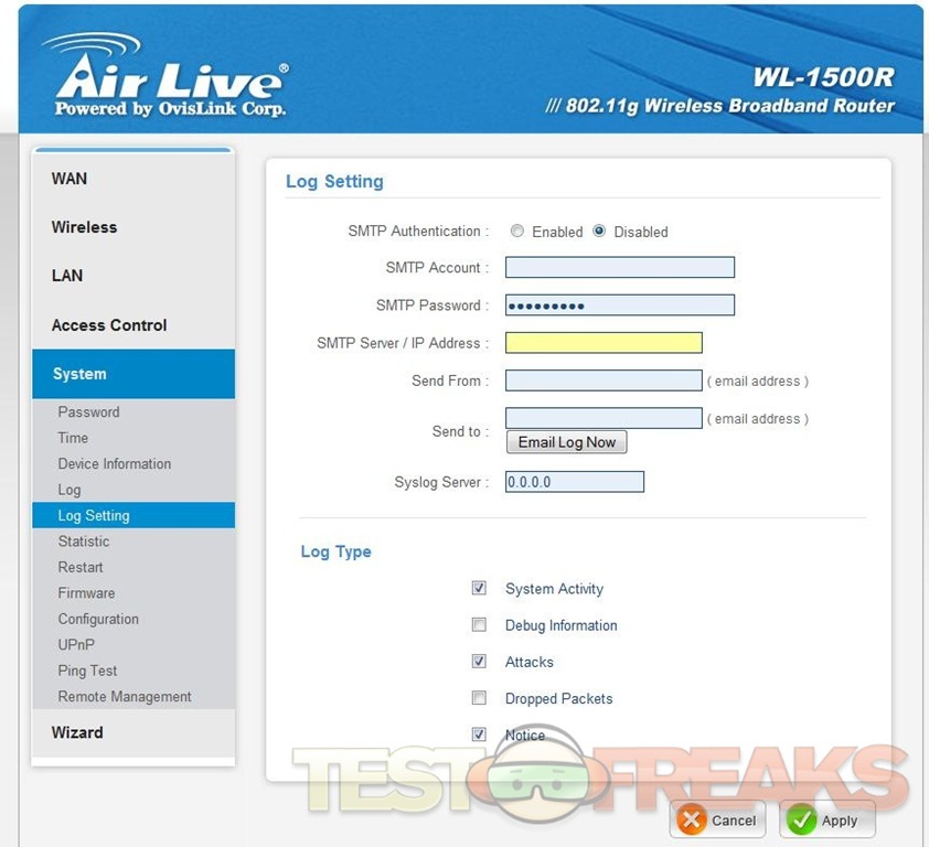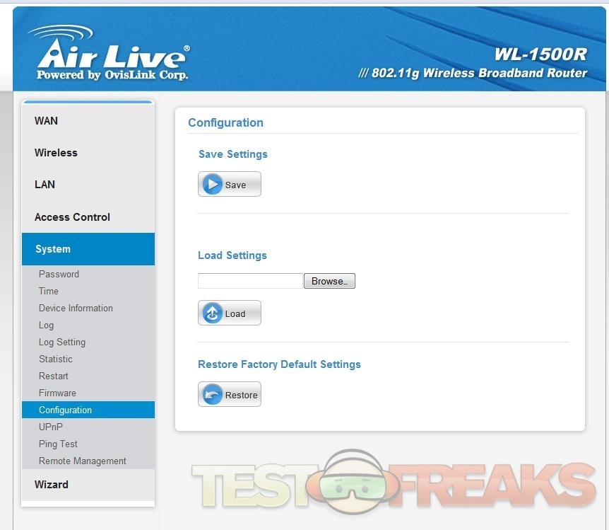 The next option is System, here you’ve got many choices in the sub menus including, Password, Time, Device Information, Log, Log Setting, Statistic, Restart, Firmware, Configuration, UPnP, Ping Test and Remote Management, again here these are all self-explanatory.