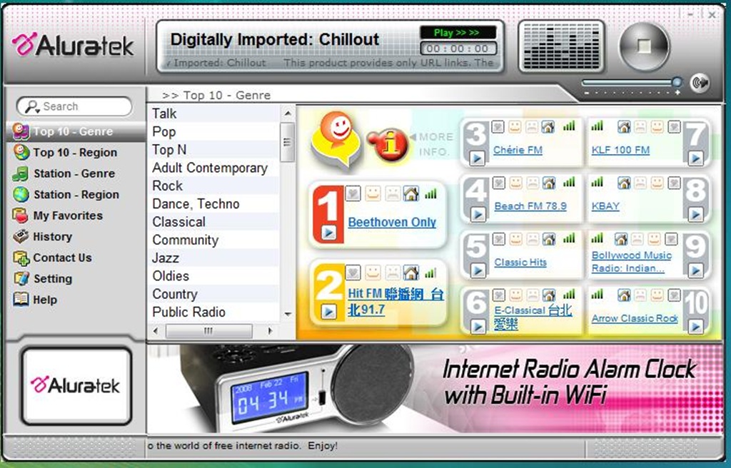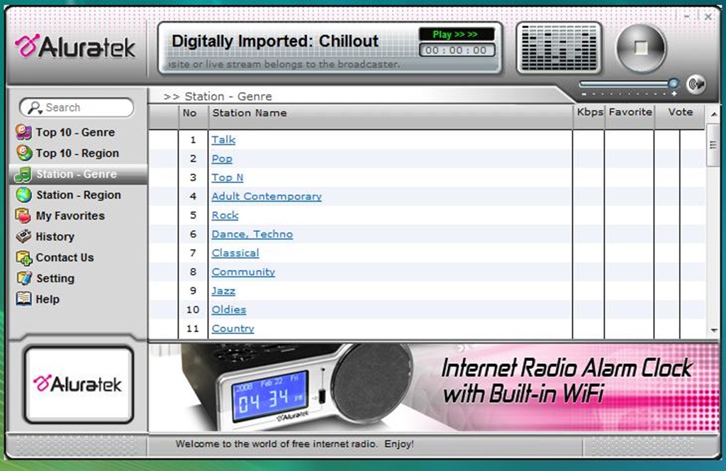 You can search for music geographically by continent / country / state or by the more than 50 different available genres including a wealth of news and sports radio stations broadcast throughout the world. Once you find a favorite station whether it is from your local country or while visiting other countries around the world, simply add it to your favorites folder. You can also search for the top ten radio stations in each country or by each genre and cast your own vote for each channel.