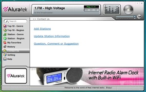 The three tabs are ‘Settings’, ‘Contact Us’ and ‘Help’ – The Help selection leads to the Aluratek website. The only settings are language and the default station to play when you plug it back into your computer.