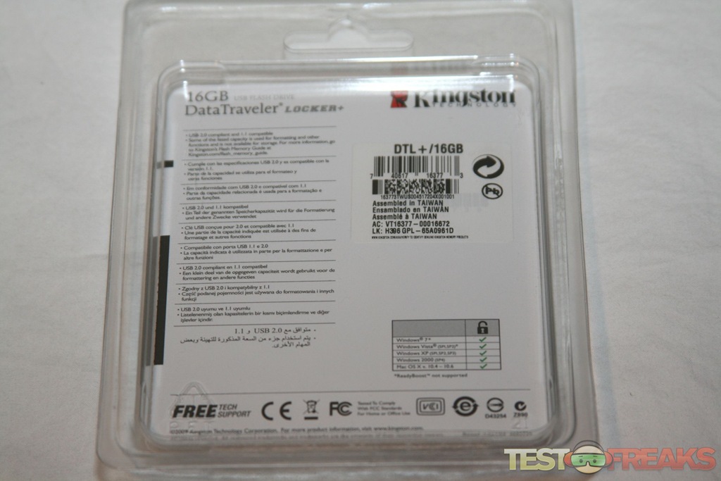 The Kingston DataTraveler Locker+ comes on a blister card with the standard Kingston packaging. On the back of this card is a list of features and an OS compatibility table. What separates the DataTraveler Locker+ from other hardware-encrypted drives is the Mac OS X 10.4-10.6 capability. As a dual OS user this is a terrific feature; thank you Kingston for the Mac love.