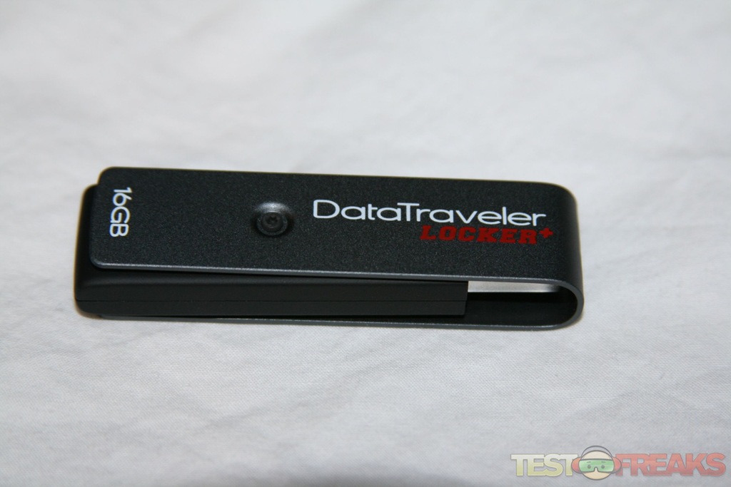 DataTraveler Locker+ is composed of a gunmetal grey aluminum exterior, which swivels off the actual drive that is covered by a black rubber material. The aluminum housing has an opening at one end for attaching the included lanyard.