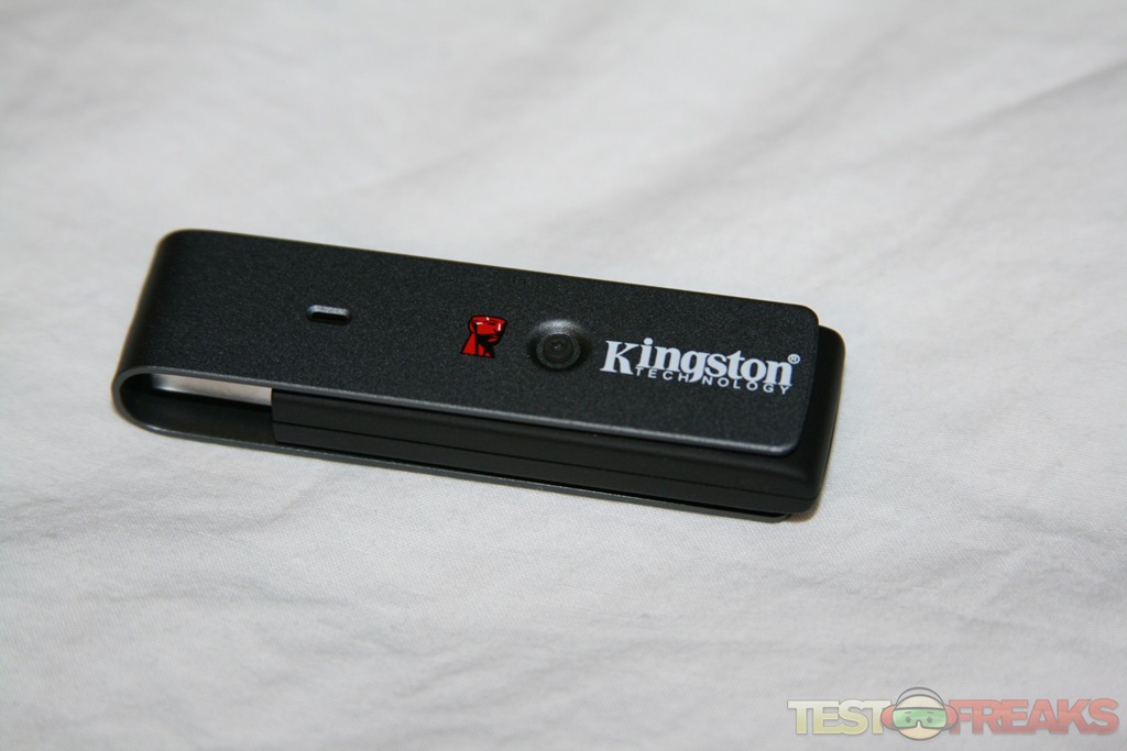 Markings on the drive include the DataTraveler Locker+ name and drive size on one side and the Kingston logo on the other. Next to this Kingston logo is an opening for the operating LED found on the black portion to shine through.