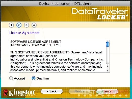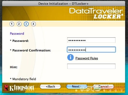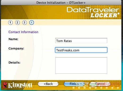 Setup takes less than a minute and involves selecting the default language, accepting the License Agreement and finally choosing a password. Kingston requires the password to be 6 to 16 characters long and contain three of the following: upper case letters, lower case letters, digits and special characters. Before the initial format Kingston allows Contact Information to be entered. Once the format is completed we see the 16GB drive on either the Windows or Apple machine.