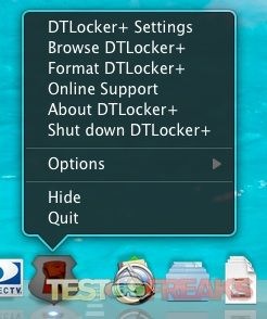 Every time the DataTraveler Locker+ is plugged into a Windows or OS X machine, the password needs to be entered to access the contents on the drive. From the Dock in OS X and the System Tray on Windows we find the DTLocker icon from which settings can be changed, the drive can be formatted or unmounted.