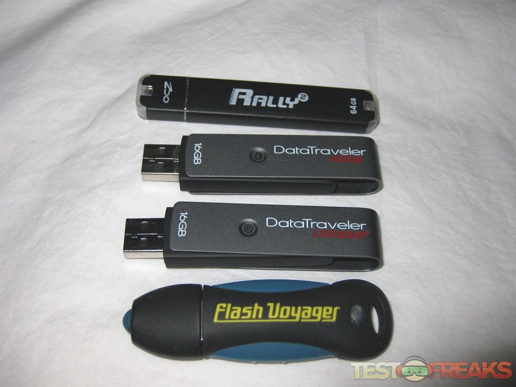 To compare the speed of the DataTraveler Locker+, I pitted it against some recent large capacity USB Flash drives including the DataTraveler 400 (16GB) (a password protected but not encrypted drive), Corsair Voyager 16GB and the OCZ Rally2 64 GB drives.