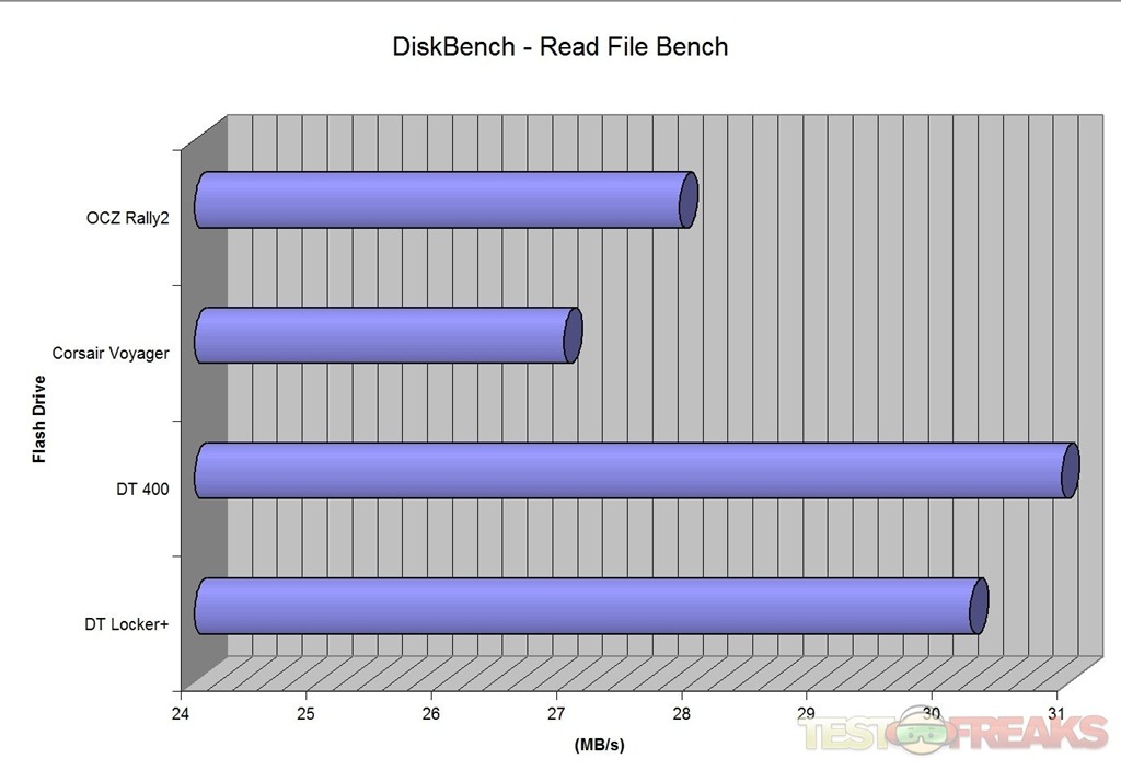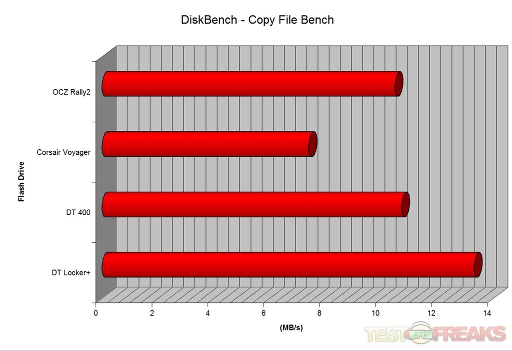 For testing I used DiskBench running the copy and read bench marks. As you can see the DataTraveler Locker+ was actually faster than the others on both benchmarks with the hardware encryption running. This was quite surprising, so I ran another set of benchmarks with the same four drives.