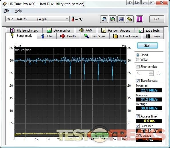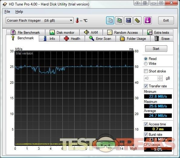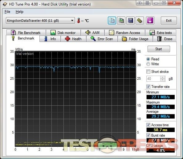 For the second test I used HD Tune Pro 4.0 running the Read benchmark. The two Kingston Drives ran at similar speeds while the Corsair and OCZ drives were slightly slower. None of these drives are designed for speed performance but for everyday use. The DataTraveler Locker+ seems to hold its own and actually stands out against these drives even with the hardware encryption running.