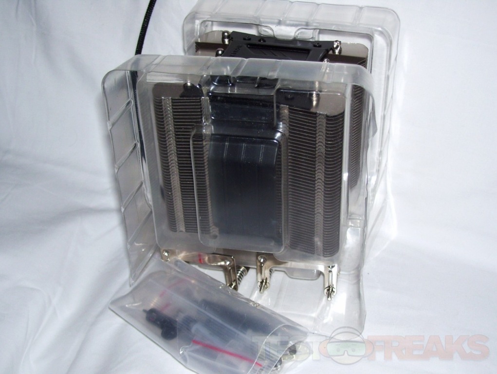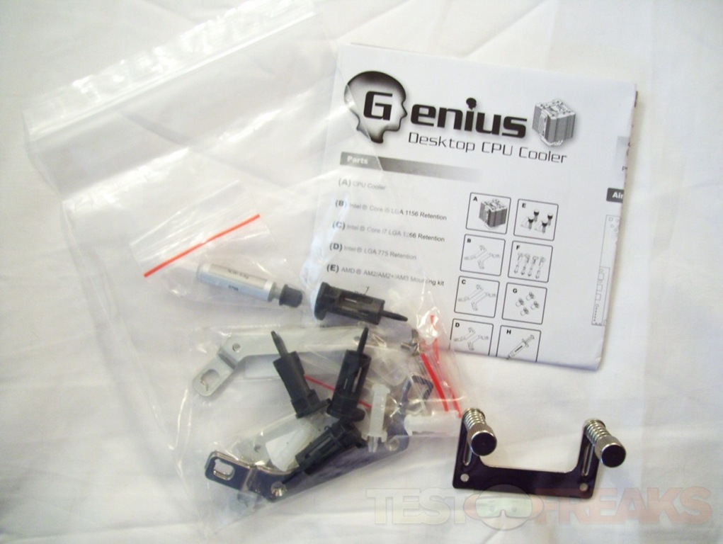 The G950 Genius comes in a standard looking CPU box. Nothing terribly fancy, just a few shots of the item and the normal spattering of specs and technical info. Inside, it is caged between two pieces of plastic on either side with the part bag tucked underneath. The part bag has screws, thermal paste, and mounting equipment for every type of socket that this cooler supports. The instruction manual just floats around the case.