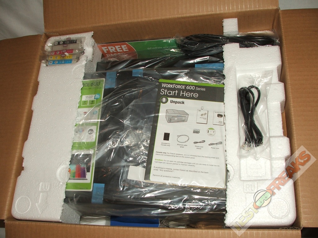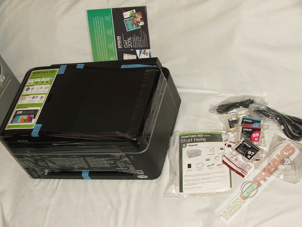 There’s a bit of stuff included with the WorkForce 600 including ethernet cable, power cable, driver/software disc, user manuals, sample paper, phone cable and of course the printer cartridges. No USB cable though, but that’s common nowadays for printers not to include one.. I’ve always wondered why they don’t include USB cables, I mean they’re cheap…