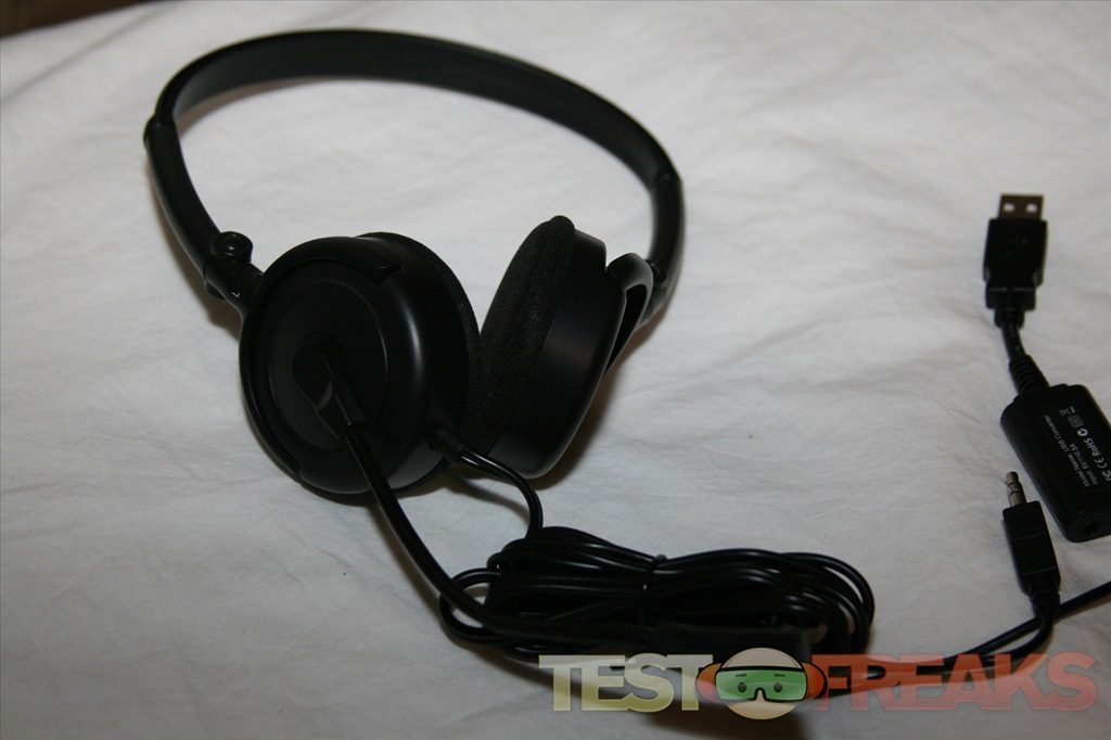 The headband is made of a relatively thick piece of plastic and is adjustable to accommodate different head sizes. The cable measures about four feet in length and Y-splits into a USB dongle and a 3.5mm headphone connection. The USB connection allows audio recording and playback via the PC or Mac.
