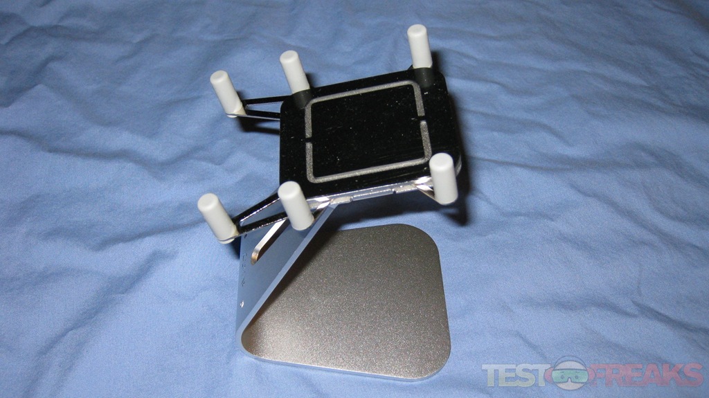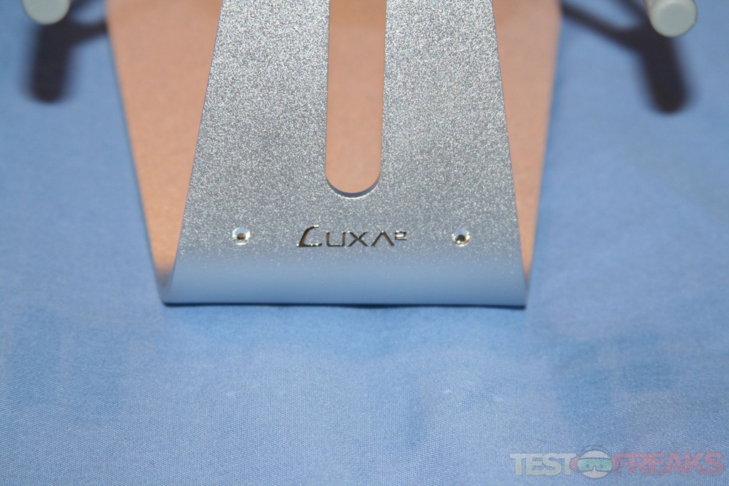 There is a tacky black rubbery pad in the center of the holder. At the base of the stand we see Luxa2 logo embossed into the aluminum. On each side of the company name is a Swarkovski crystal. At the base of the stand is another rubbery slip resistant pad.