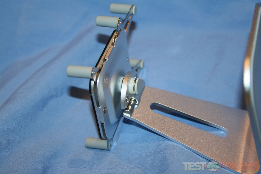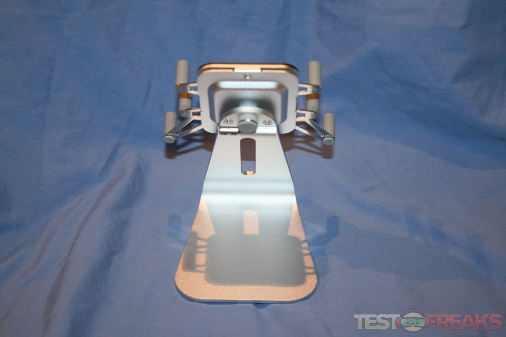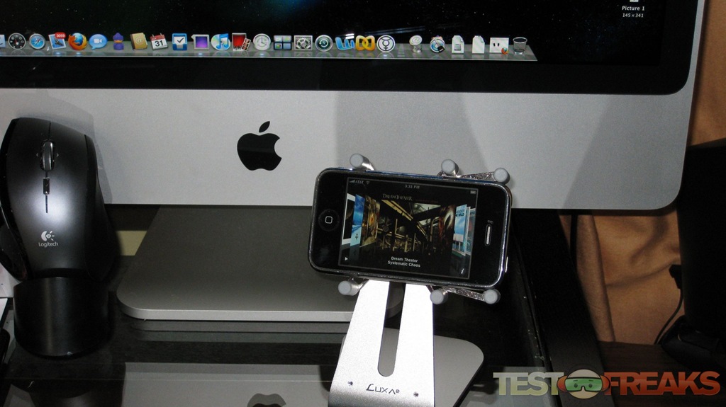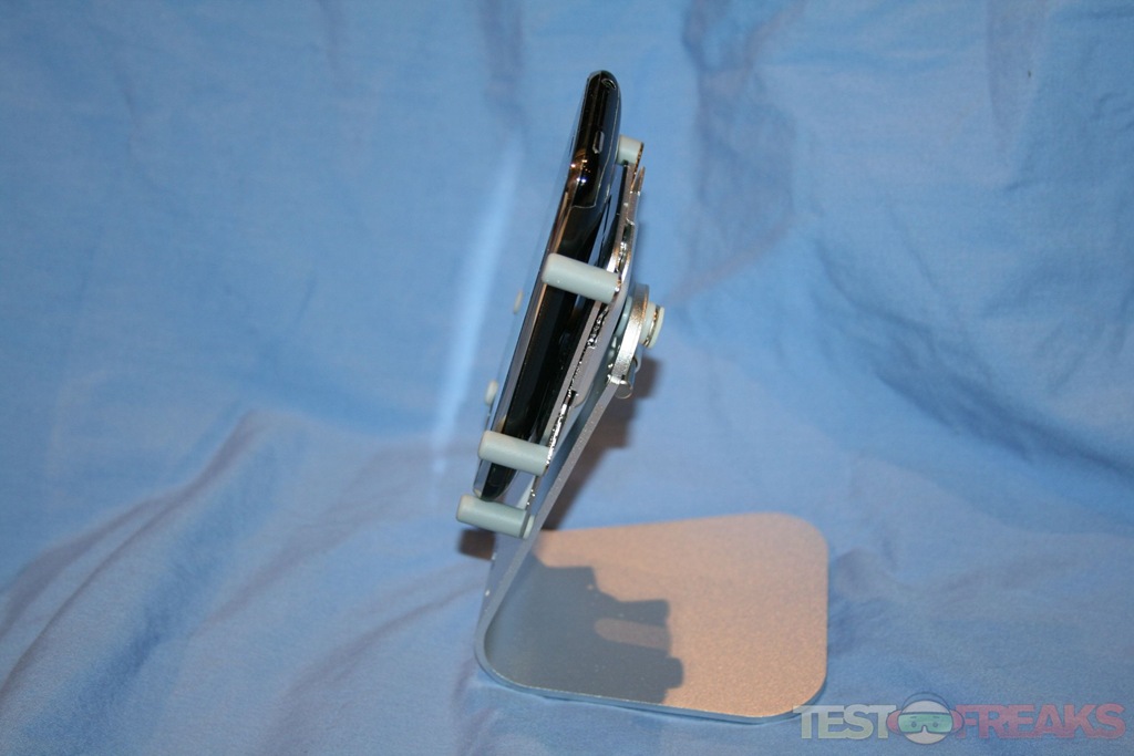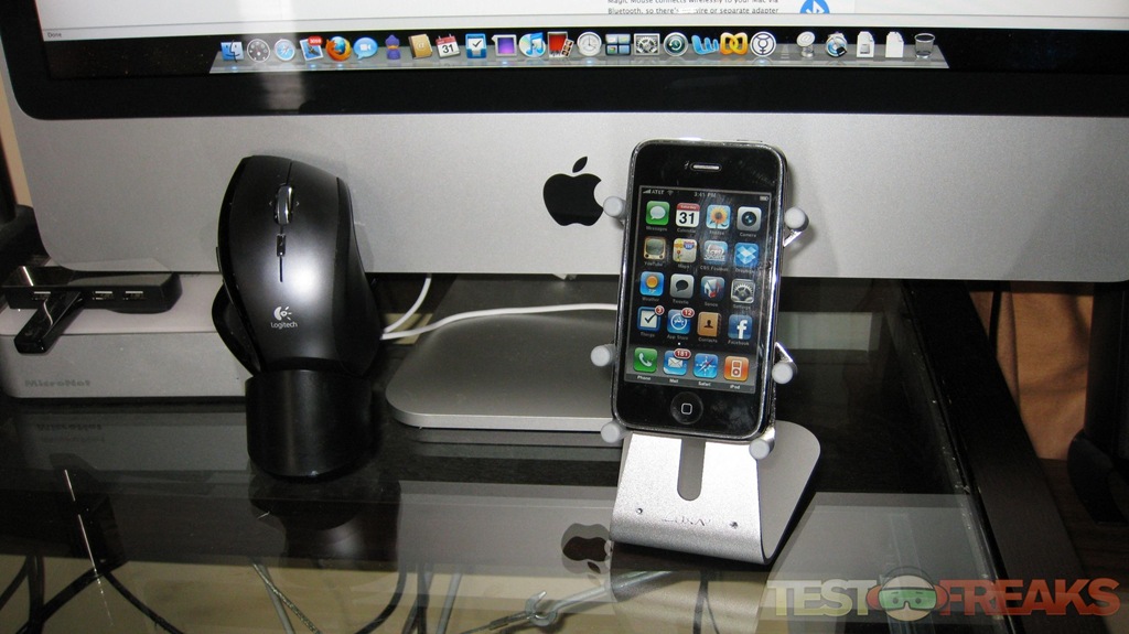 The H1-Touch is well constructed and seamlessly matches the motif of the aluminum iMac. Inserting my iPhone was simple and the rubbery support grips kept the phone securely in place. Switching from portrait to landscape simply involves rotating the front pivot 90° in either direction. The second pivot allows the stand to flip the device to the other side of the H1-Touch for sharing the view with other people.