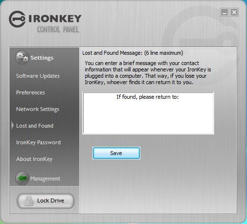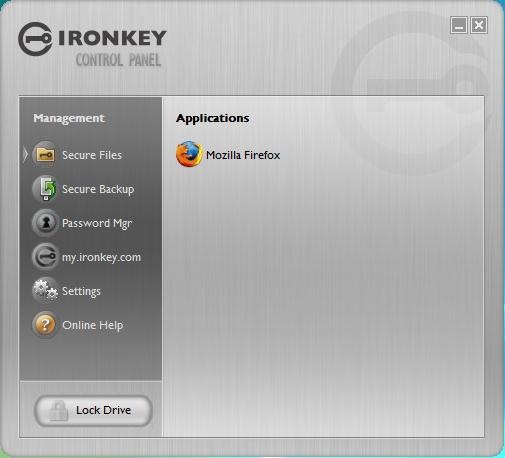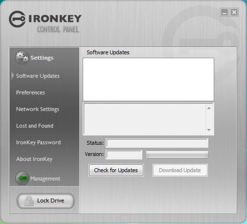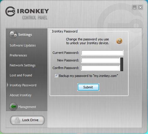The things that you can do with the interface though are: Backup and Restore, Password Manager, Password Generator, Software Updates, Set Lost and Found info, Change your IronKey Password, and change network settings.