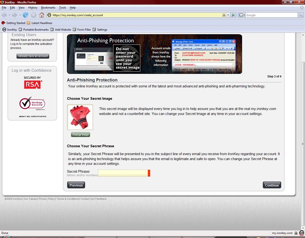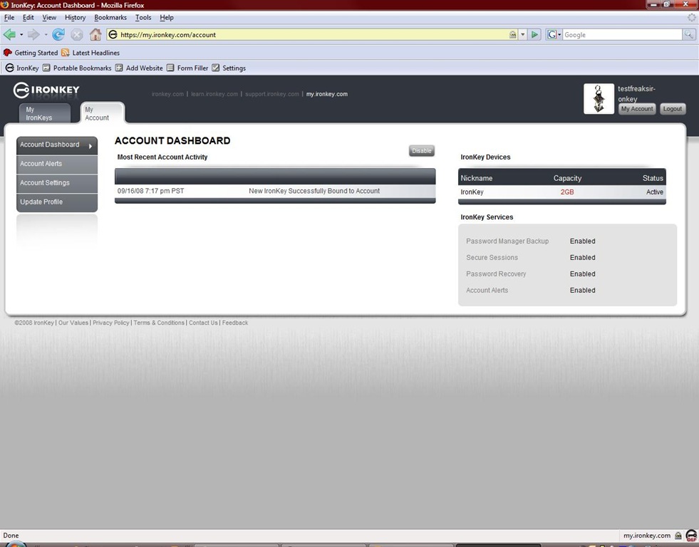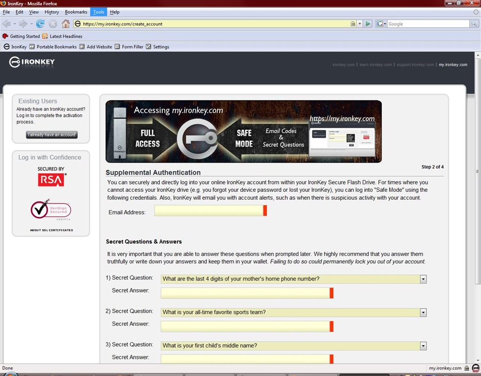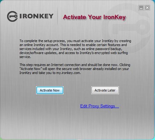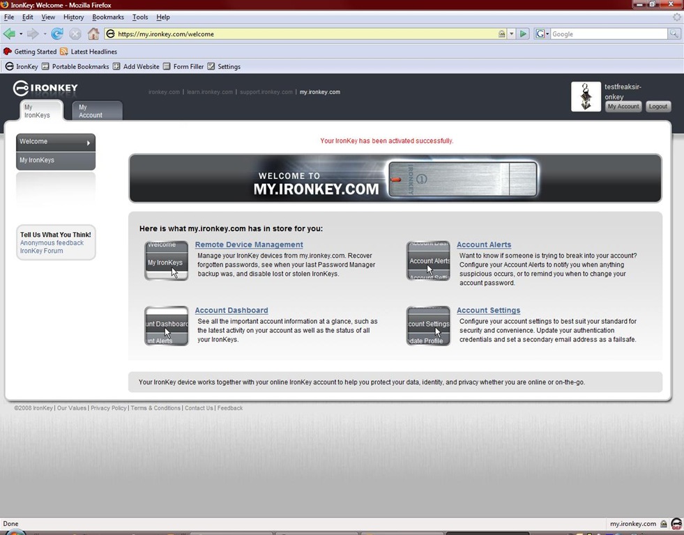 Next thing to do is activate your IronKey, the onboard secure FireFox launches and takes you to the secure registration/activation site. From there you have access to other account information as well like password backups etc.