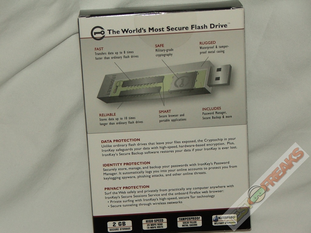 The IronKey comes in a fairly large box for a USB Drive, it’s mostly padding really and included with it is a small nylon strap and user manual. On the back of the box is a nice diagram showing you what the insides of the IronKey look like as most likely you’ll never see them!