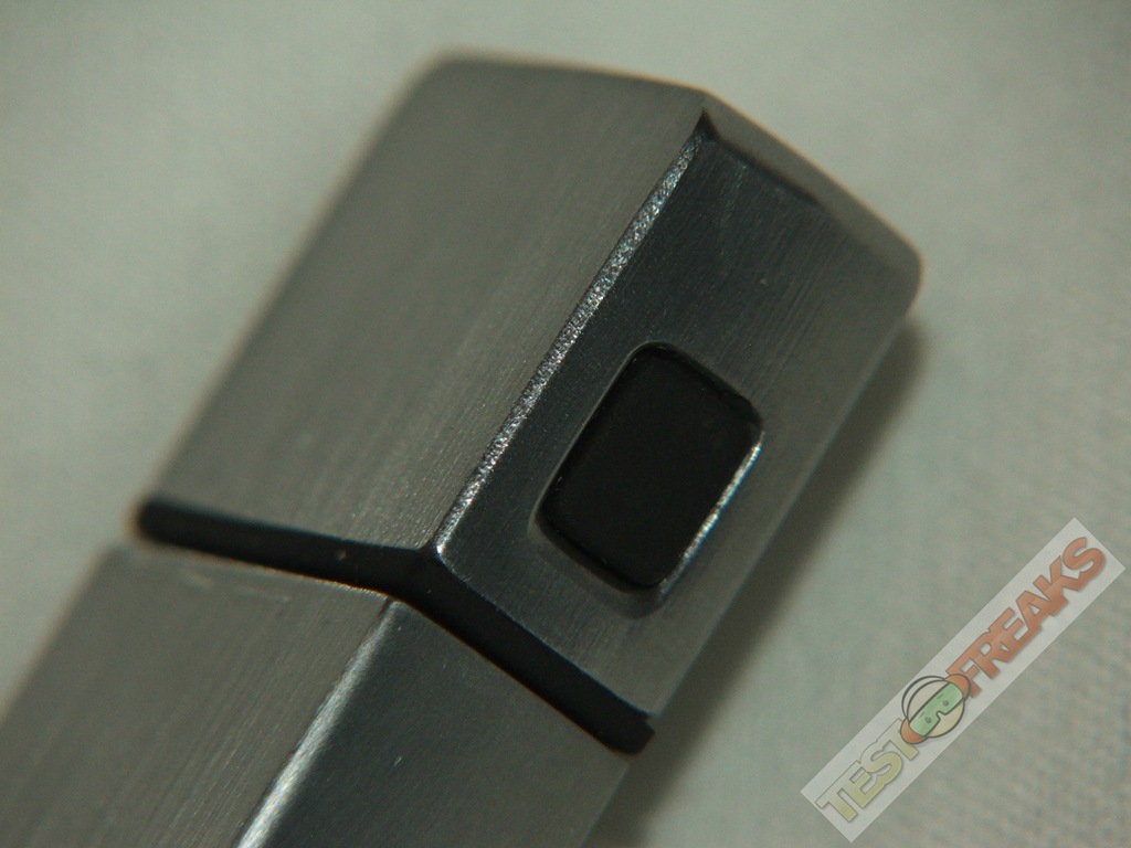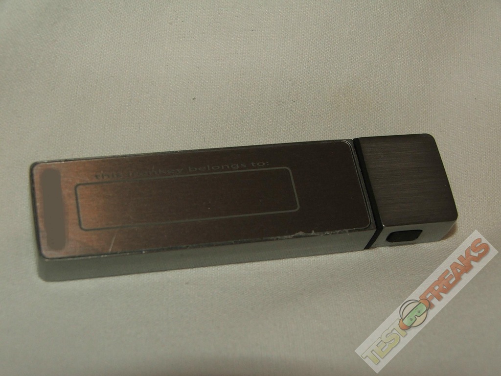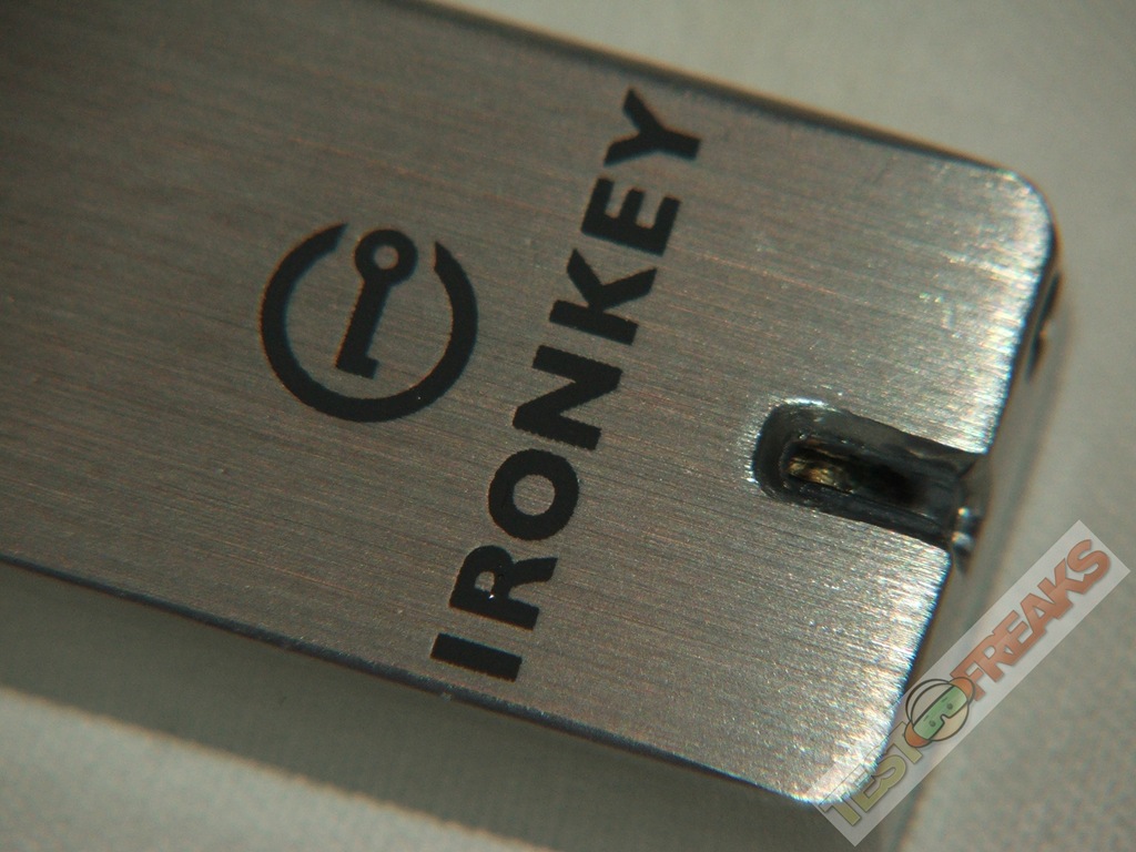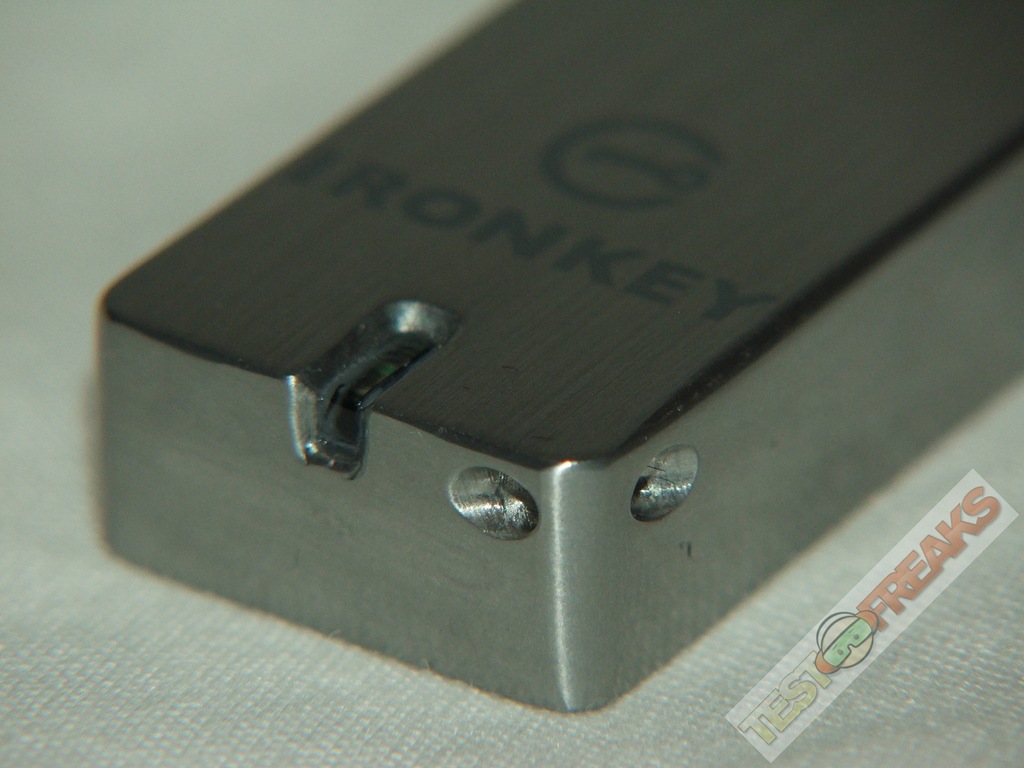 as for design, the Ironkey is well, Iron like?!? it’s a big block of metal basically with the IronKey logo on the bottom with an LED indicator there as well. On the corner of the IronKey is a small hole that goes through where you can attach the included lanyard.
