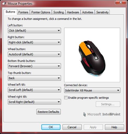 The user interface, Intellipoint, is pretty basic, only three of the seven tabs really pertain to the SideWinder X8. You can change the button functions, assign DPI to the buttons and change the scrolling, the others are basic stuff for all mice.