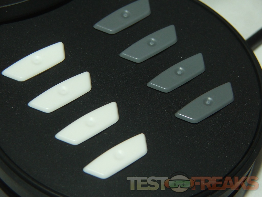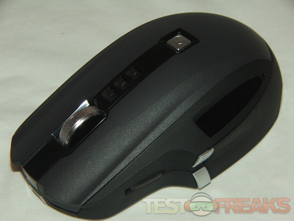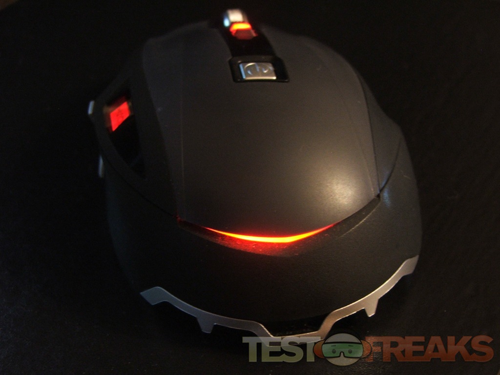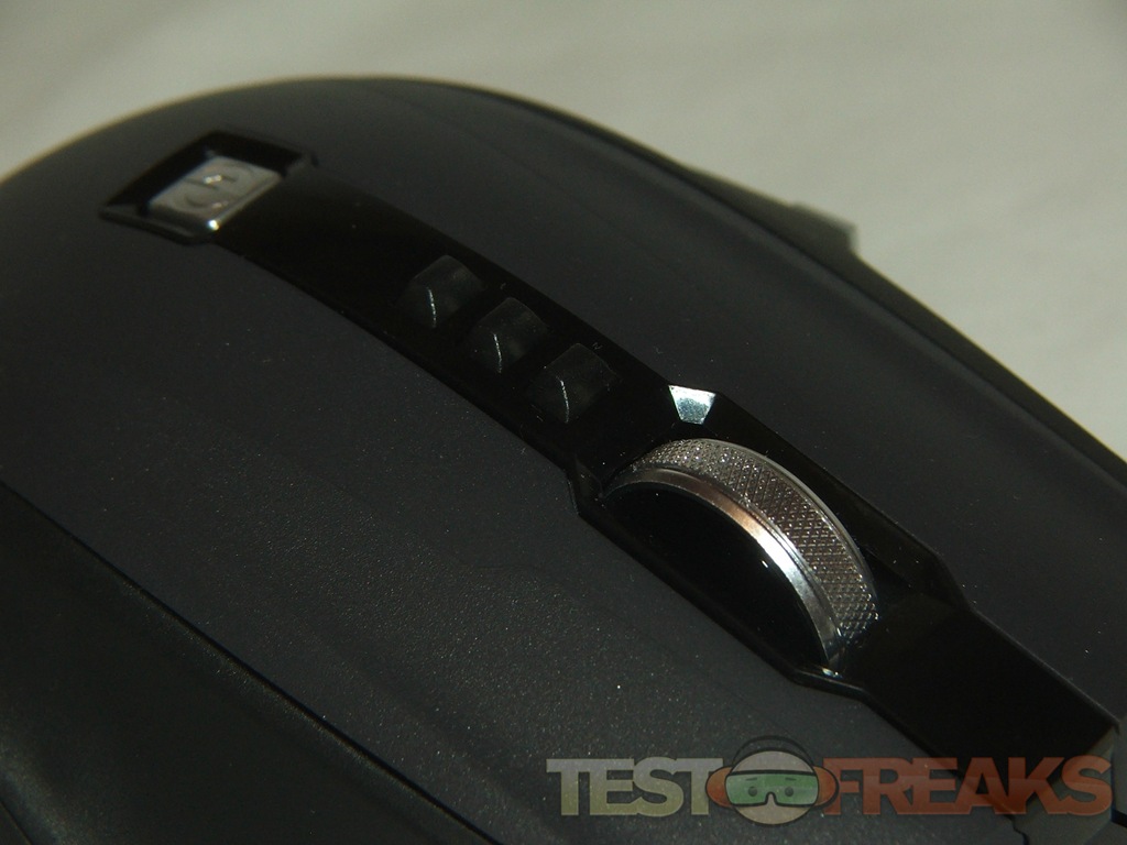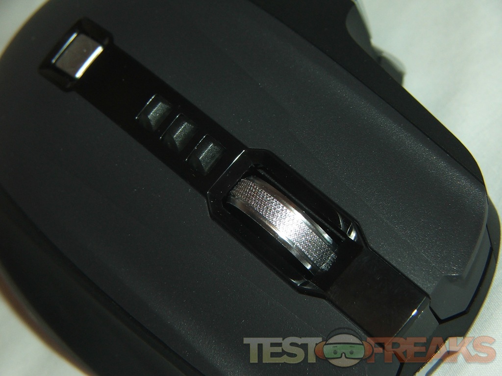 On the top of the X8 you’ll find the regular right and left buttons along with four more, three small black buttons are for changing DPI settings, and the square silver one is a quick launch button, in Vista it opens the gaming folder. The scroll where is a buttons as well, and it can tilt from sided to side for side scrolling, it’s a clicky style so it’s audible when you scroll with it.