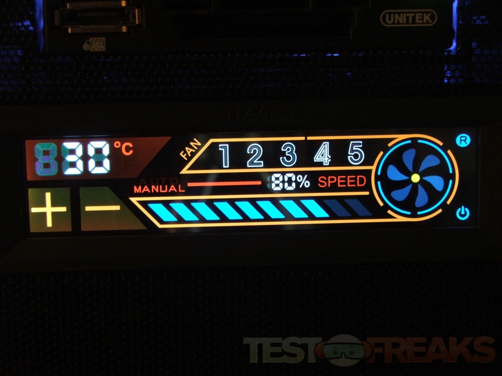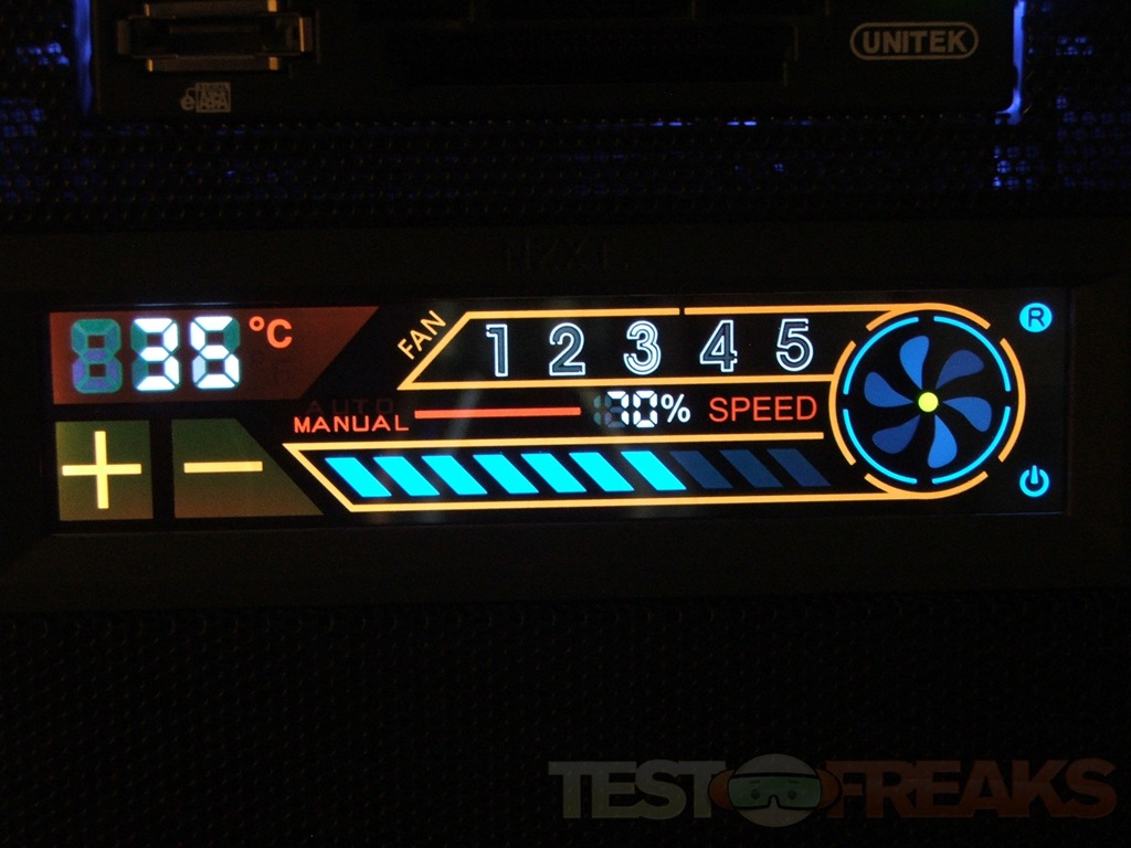 Using the Sentry 2 is easy, just touch screen. The fan graphic is a button, you tap it to change the fan you are trying to control. The plus and minus buttons are also touch sensitive to adjust fan speeds up and down, and there is a small touch area in the center of the Sentry 2 that allows you to switch between auto and manual fan control modes. The temperature is also touch sensitive, touching it switches between Celsius and Fahrenheit.