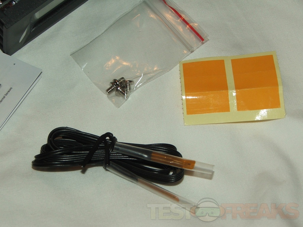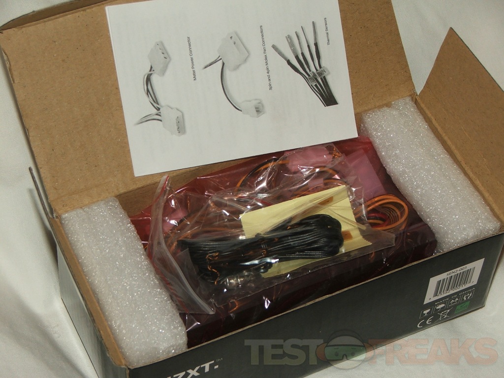 The NZXT Sentry 2 comes in a tiny little box with a picture on the front and information listed on the back. Inside we find the Sentry 2 packed well, included with it is a brief instruction sheet, screws, adhesive strips, and a couple extra temperature probes.