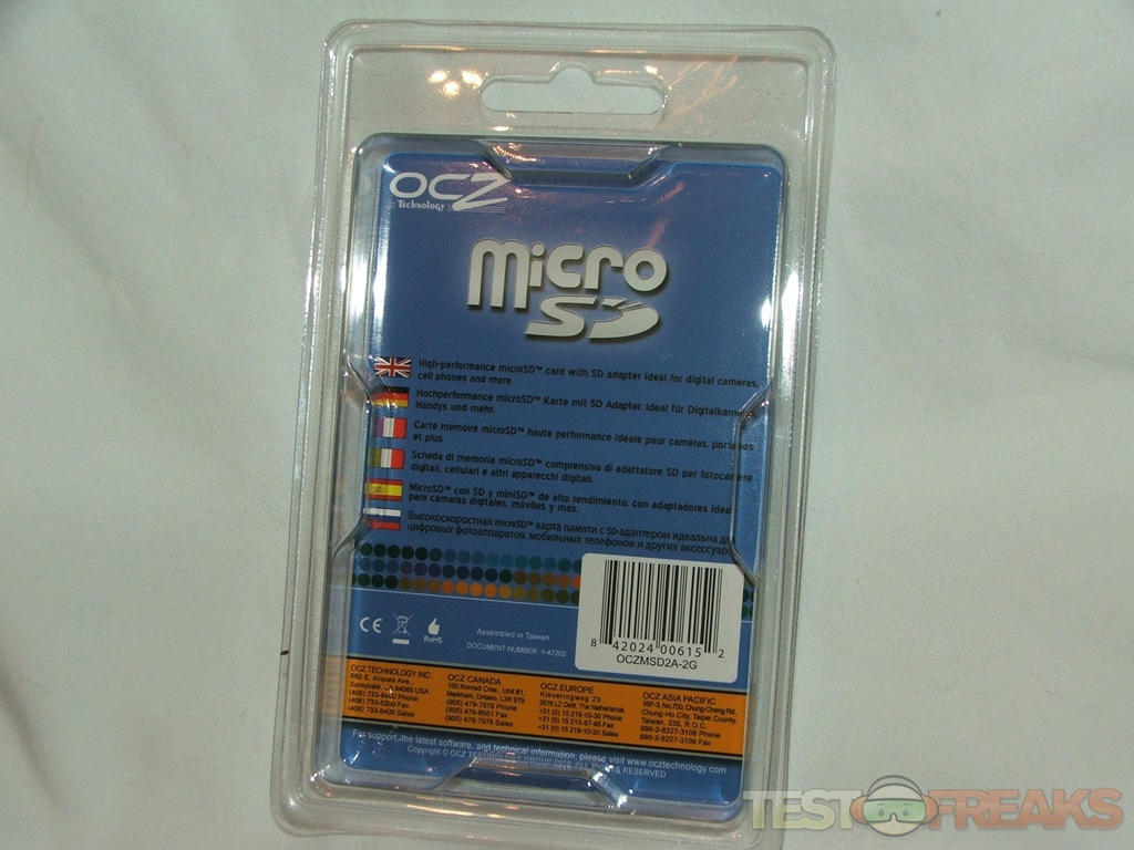 The OCZ 2gb microSD card comes in the standard sealed plastic clamshell style package, you can see the card, adapter and case through the package along with some basic information listed.
