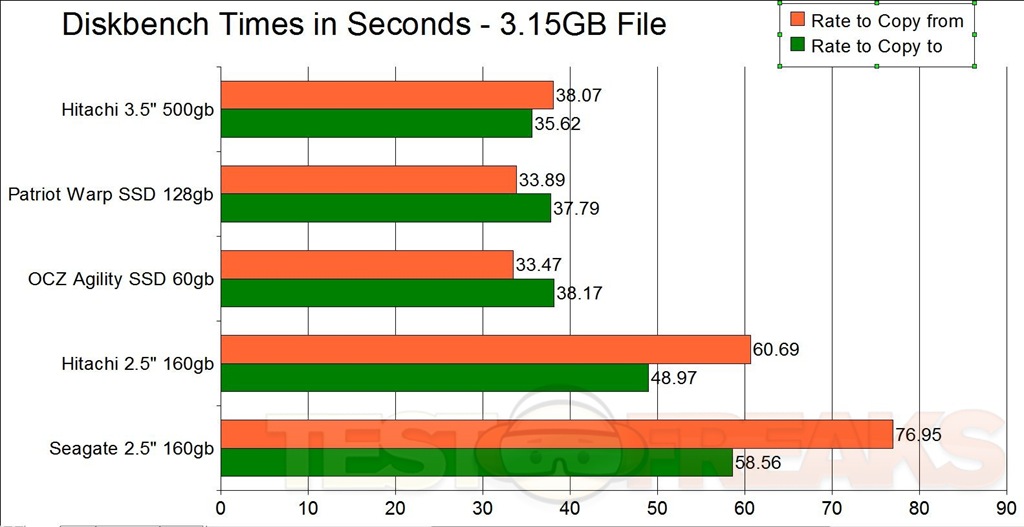 We see almost the same results with the larger file as we did with the smaller file, in terms of relative times and ordering but the Patriot seems to handle the larger file just a bit better as the positions are switched, with the OCZ moving to third place here. Still thought the times are very close, less than a seconds difference for both tests on the SSD drives.