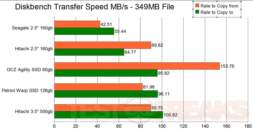 For the last test I’ve got DiskBench, but it’s actually two more tests really. Both tests measure the times to Copy From and Copy To the drives, and they report the Transfer Rates as well.