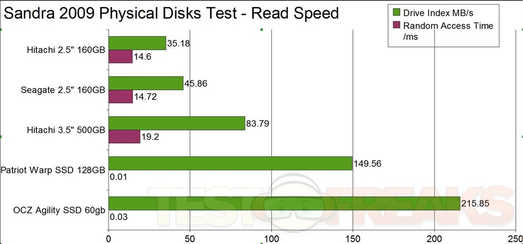 Next up I’m using SiSoft Sandra 2009 SP4 Physical Disks Benchmark (Read Test). The chart is organized lowest to highest Drive Index Score.