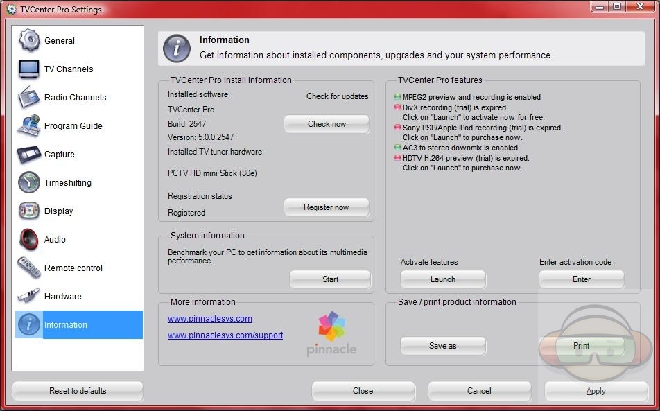 The last page of the options is titled information, you can check for updates, register your product, benchmark your system and activate features. Now activating features is interesting because for some thing you’ve got to actually pay more money for, like HDTV H.264 and Sony PSP/Apple iPod recording, but the DivX recording is free. You’ll need to click ‘Launch’ and it will open in your browser giving you a few choices to buy the features or codecs, since the DivX was free I grabbed it of course. I got a key from the site and then came back to the information page and hit the ‘Enter’ button under the Enter Activation code option, this enabled me to record to DivX format.