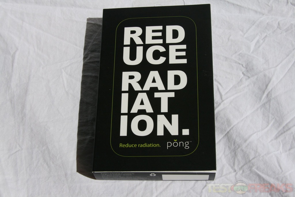 The Pong Research iPhone case comes in a cardboard package with the words reduce radiation on the front foldout cover. Behind this cover we see the features of the case on the left-hand side with the iPhone case visualized on the right through a plastic window which details how the device works. On the back are some facts about cell phone radiation and a few features about the case.
