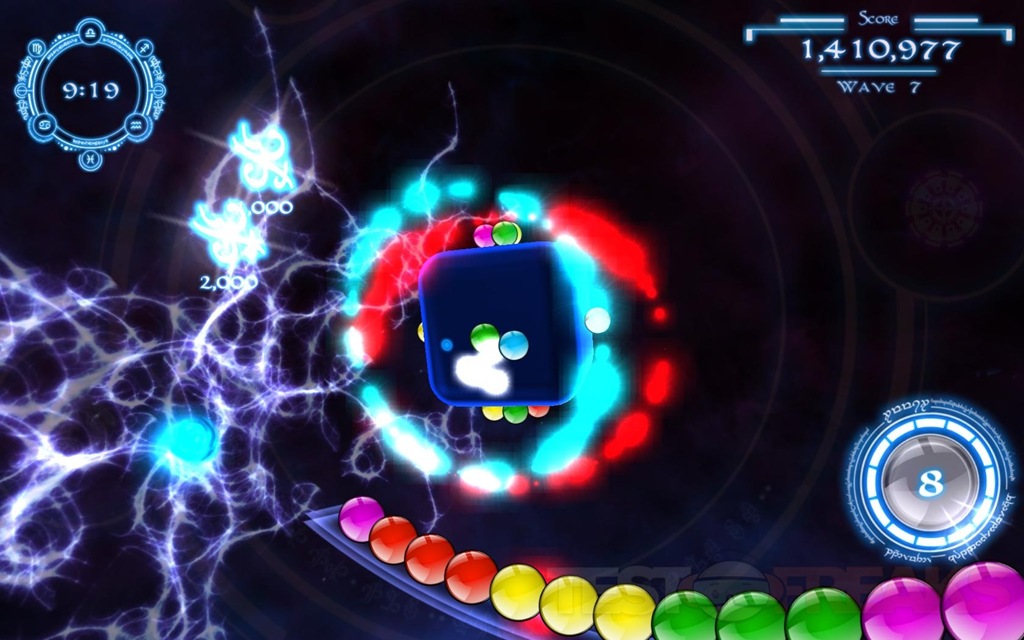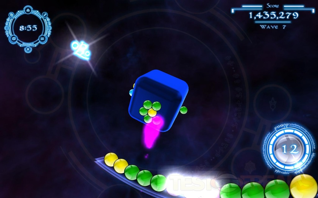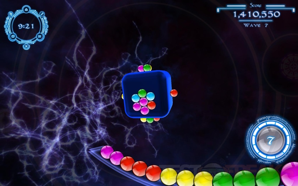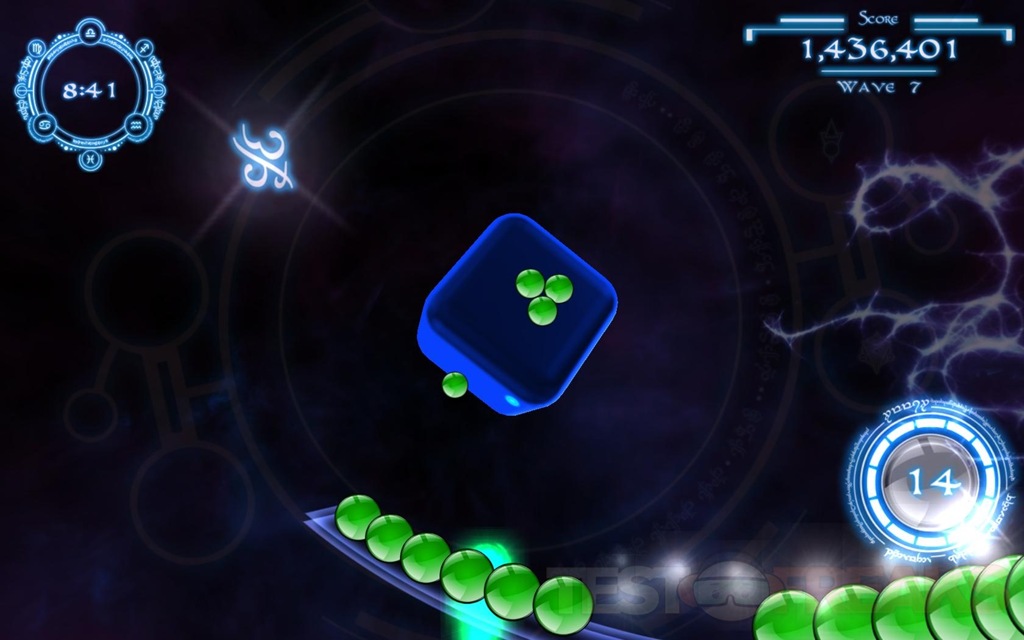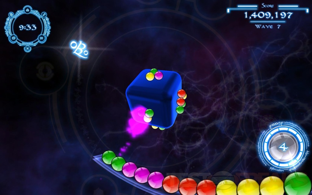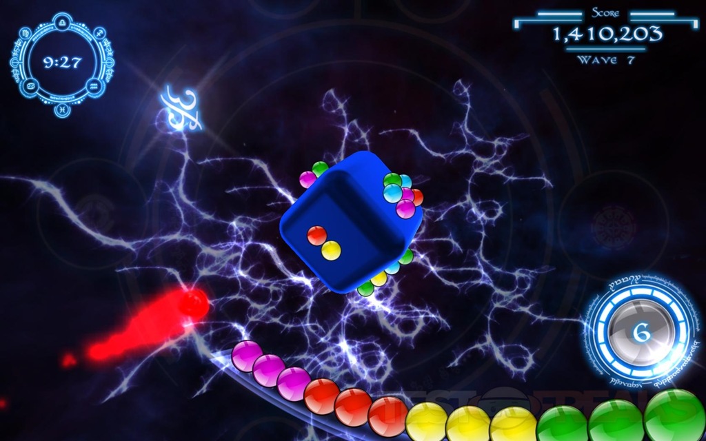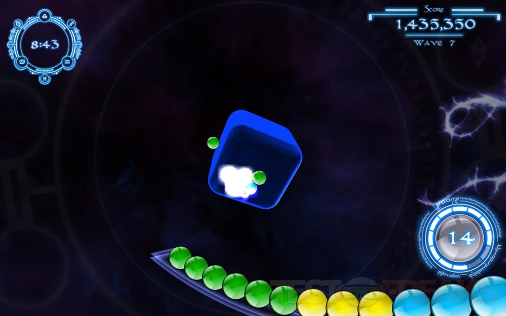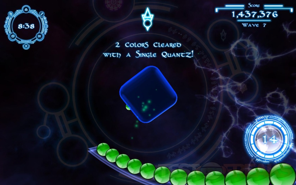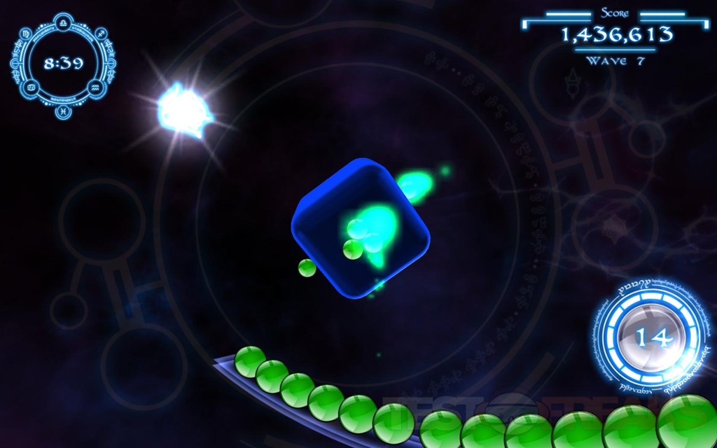 The idea of rotating the cube is to not only line up your shot, but you can move the marbles around the cube, moving the cube quickly or suddenly will cause the marbles to launch off of the cube, and they will slowing float back down as if a gravitational force was acting upon them. As the QuantZ are floating back down you can rotate the cube to re-group the marbles the way you want them to make the needed groupings. There are also bonus fireballs that will appear in a certain color after you get a nice grouping destroyed, wherever you shoot the fireball all of those colors on that side of the cube will explode, helping you quickly clear a color group.
