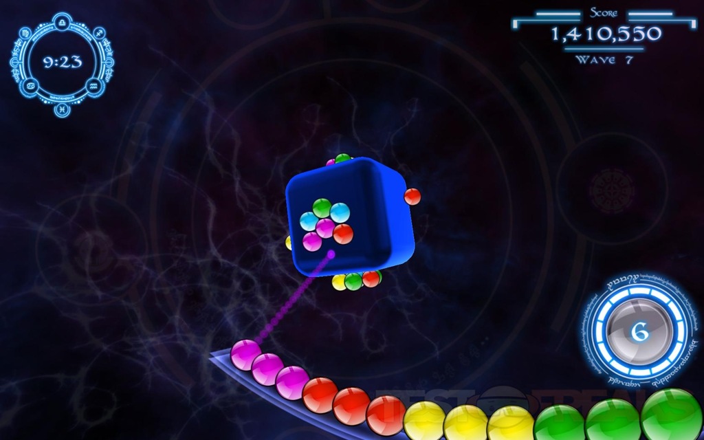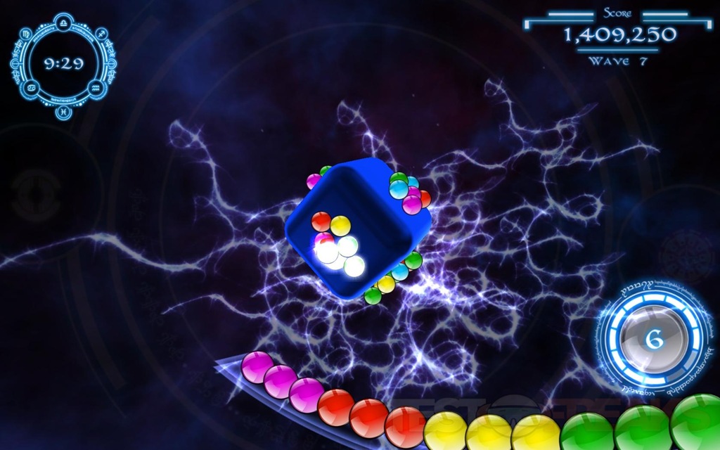 The premise of QuantZ is to break the marbles or QuantZ that are on a rotating cube. There’s a rails on the bottom of the screen where the upcoming QuantZ sits waiting to be launched at the cube, you’ve got to match four or more for them to explode. The twist here is that you can twist the cube, QuantZ relies on physics processing, and it handles it well. The cube can be rotated any which way, and you can move it fast or slow depending on the speed you move the mouse.
