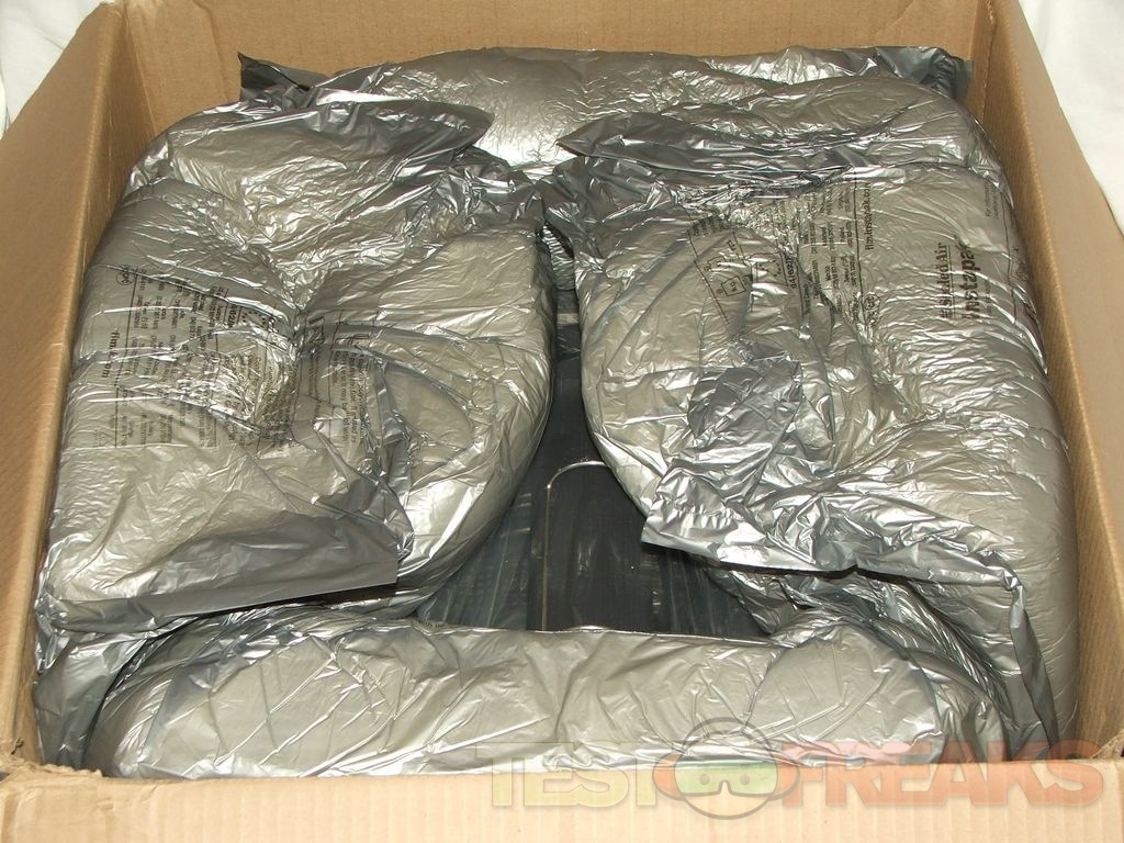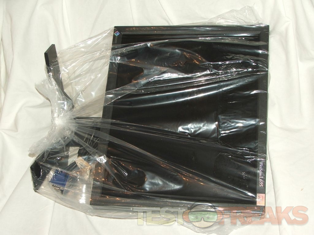 Underneath the padding we find the monitor wrapped in plastic.