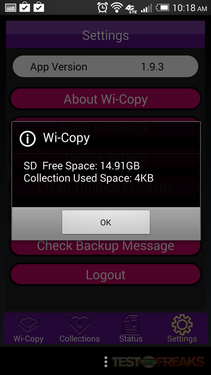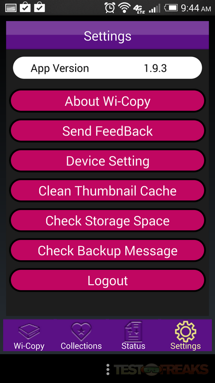 Here’s the settings section of the Wi-Copy app for you with really just a few choices. The Device Settings option take you to a webpage where you actually interface with the Wi-Copy like you would a router.