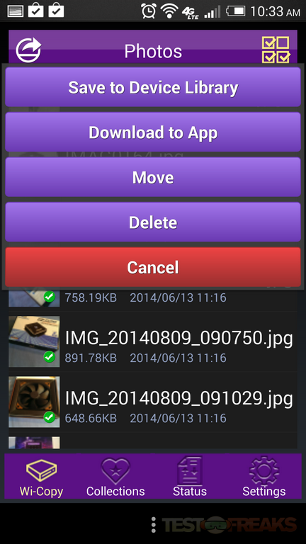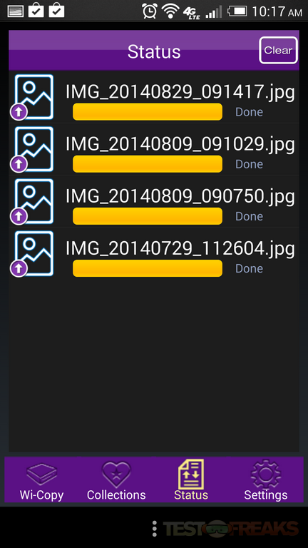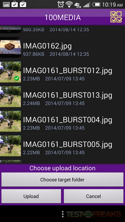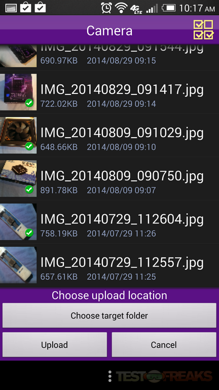 To copy the files from your phone you just navigate to them, select which ones you want and press upload and let it do its work. Speed was very fast, I transferred both large and small sized pictures.