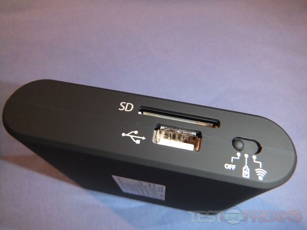 On the left side of the Wi-Copy is the SD Card slot and USB port along with a three position switch for power, battery and wi-fi.