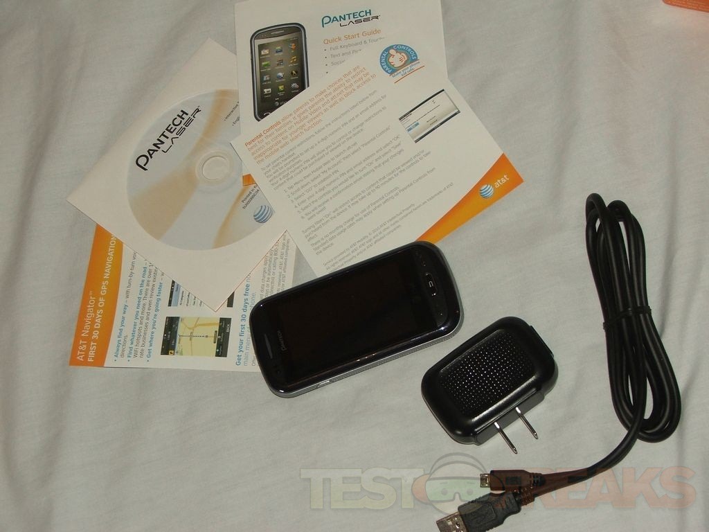 The Laser is for AT&T so it comes in the branded box along with a USB cable, and USB style AC adapter.