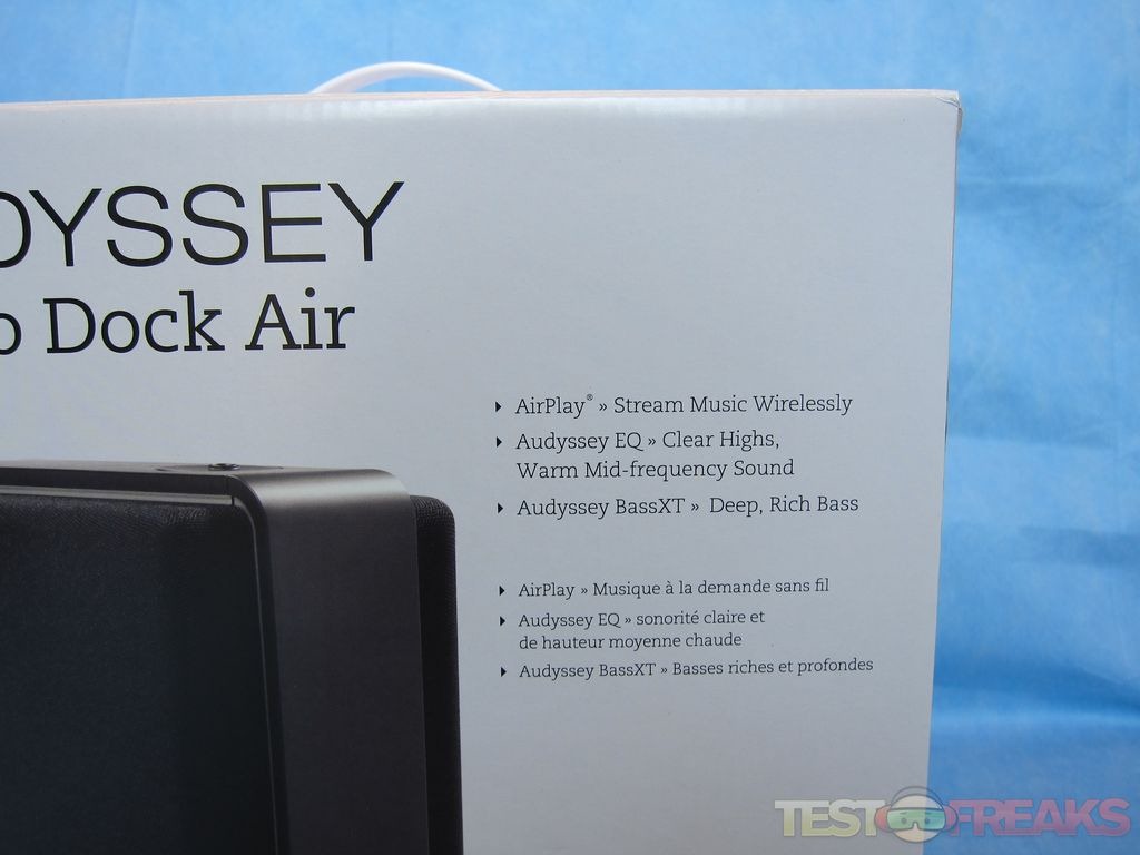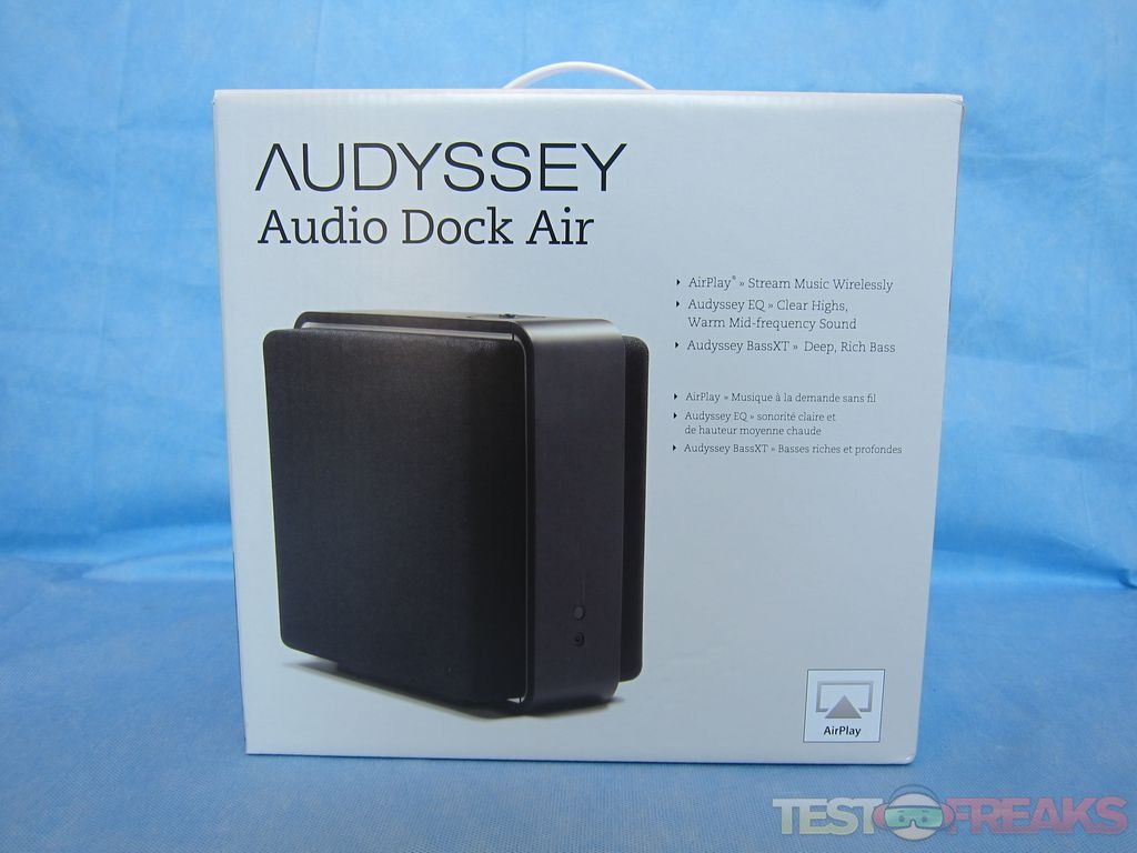 The Audyssey Audio Dock Air arrives in a white cardboard package. The front of the box has an image of the Audio Dock Air, the AirPlay logo along with a description of its features in English and French. One side of the box has another picture of the Audio Dock Air being used by a young woman and on the back is another list of features, specifications and a product blurb in English and French. Finally on the other side of the package are four additional language descriptions for the product.