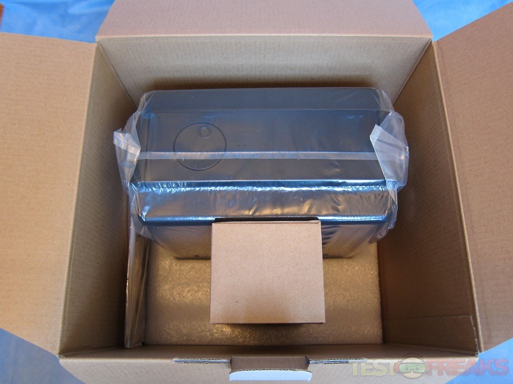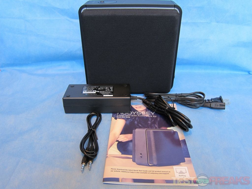 Opening the box we find the Audyssey Audio Dock Air wrapped in plastic and protected by two foam inserts. Also included are the power supply, 3.5 mm audio cable and quick start guide.