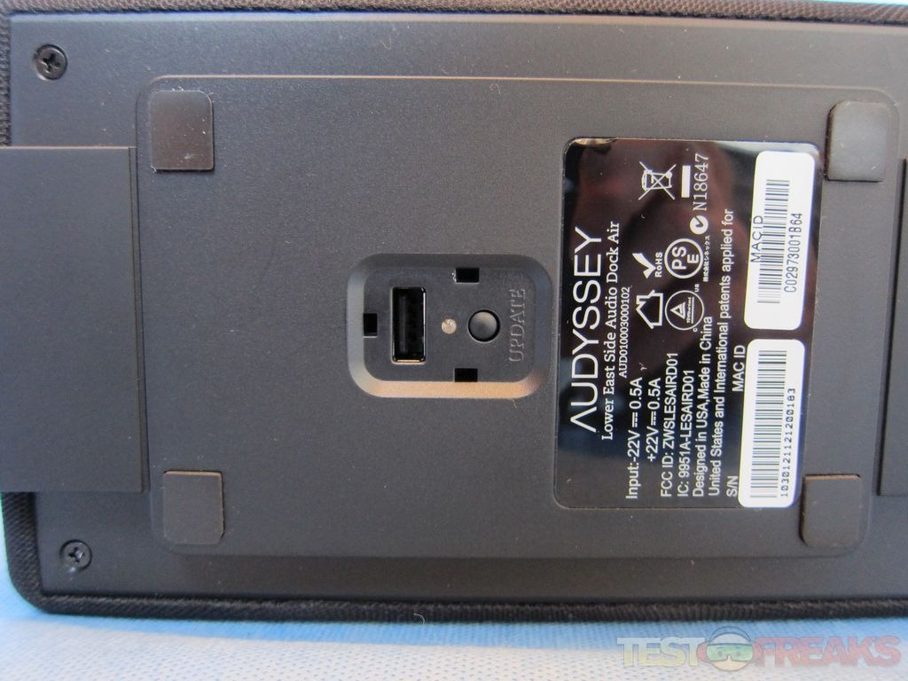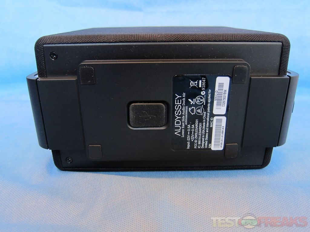 Underneath the Audio Dock Air are four rubber feet and a rubber covering for a USB connector that is probably for updating the device’s firmware.