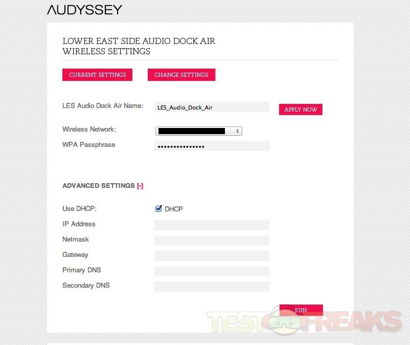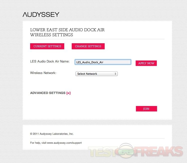 Next log into your web browser of choice and enter this address – http://192.168.1.110; this will open the Audyssey Audio Dock Air configuration screen. This setup/status interface allows the customization of the Audio Dock Air’s name and home Wi-Fi network selection.