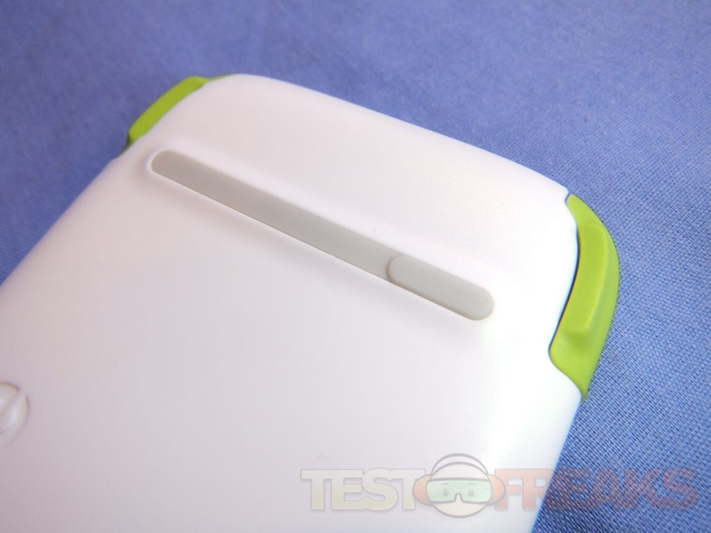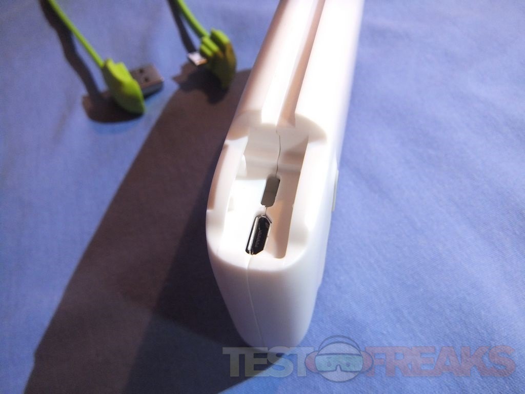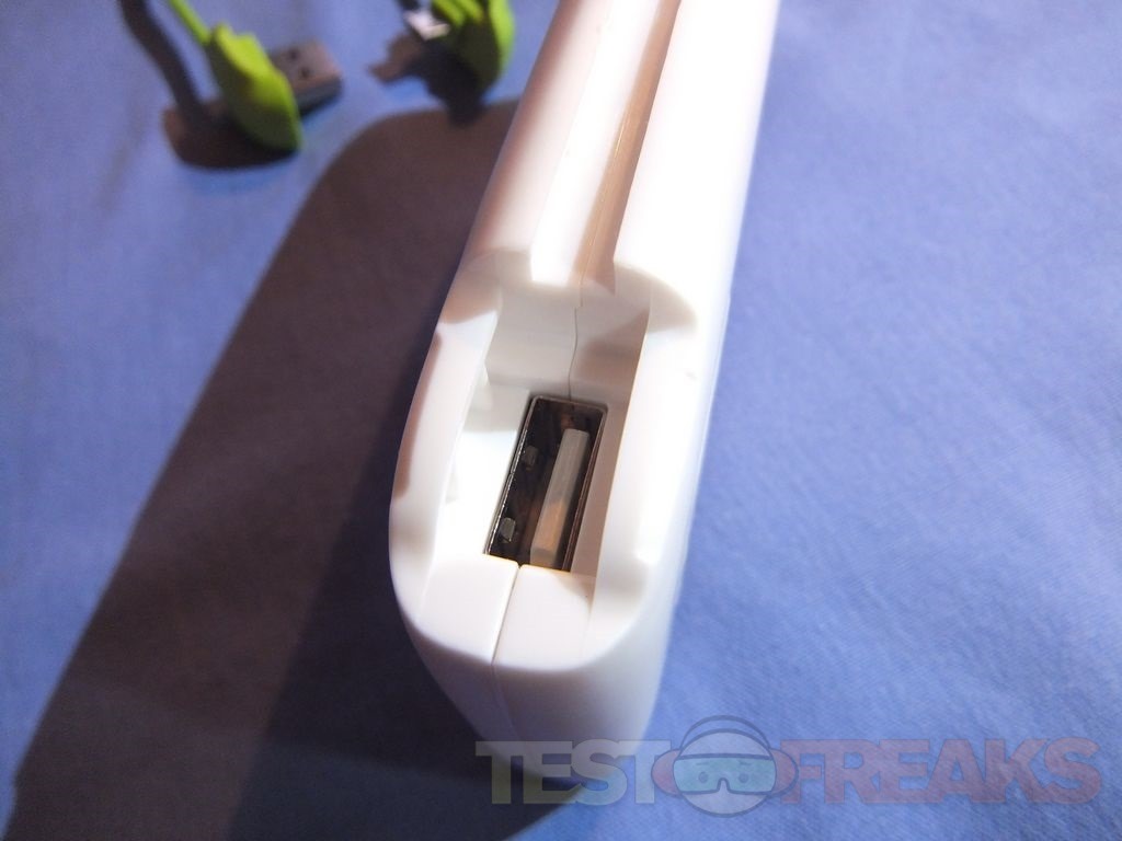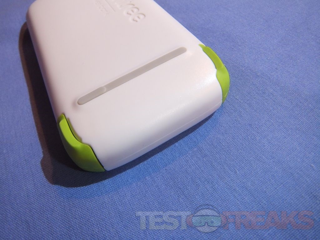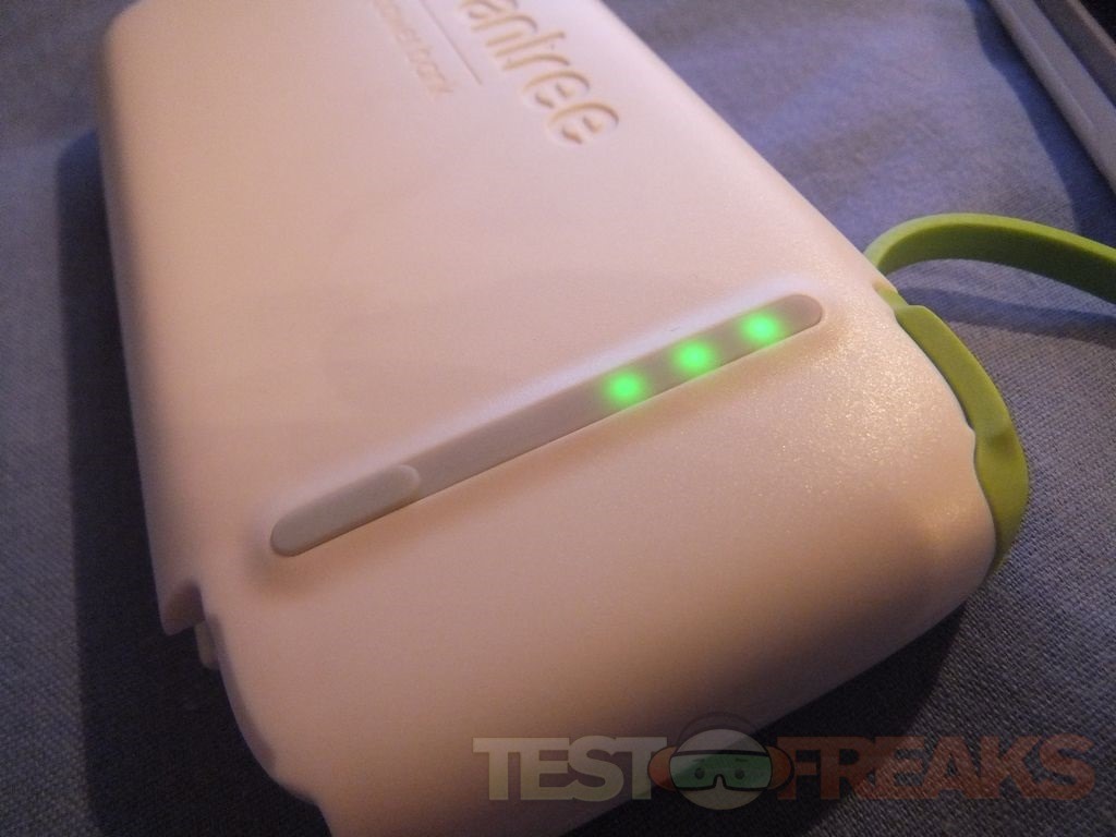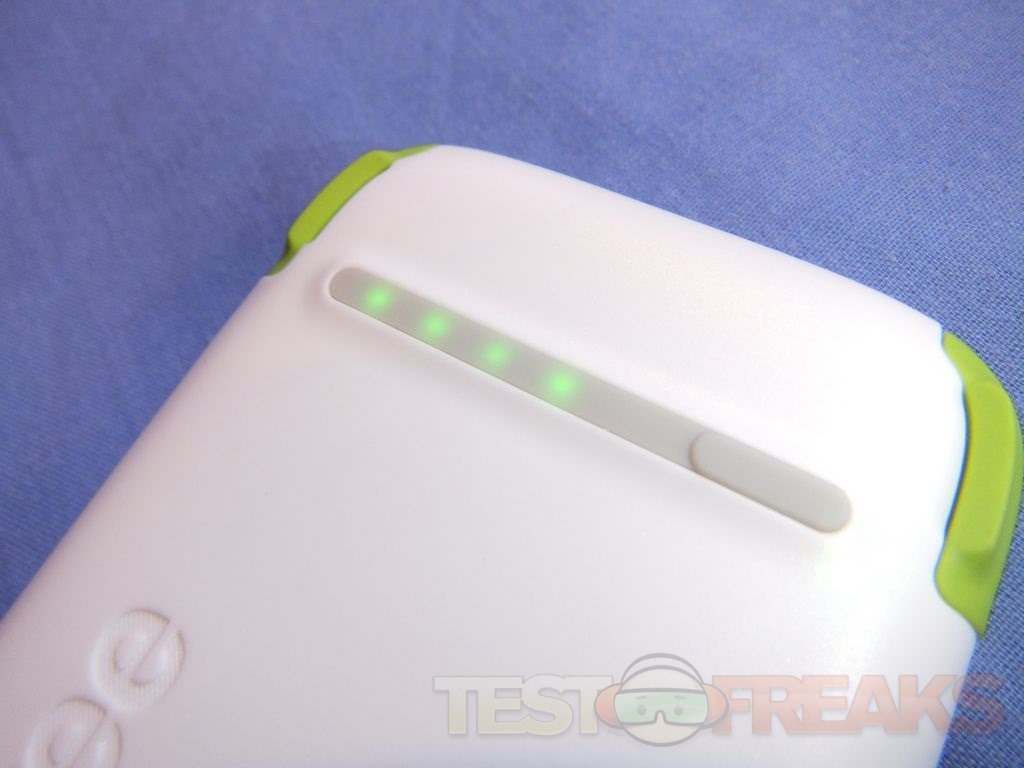 On the front is a gray stripe with a button on it that is used to check the battery status an to start charging. There are four LEDs each representing 25% charge to let you know how much battery capacity is remaining.