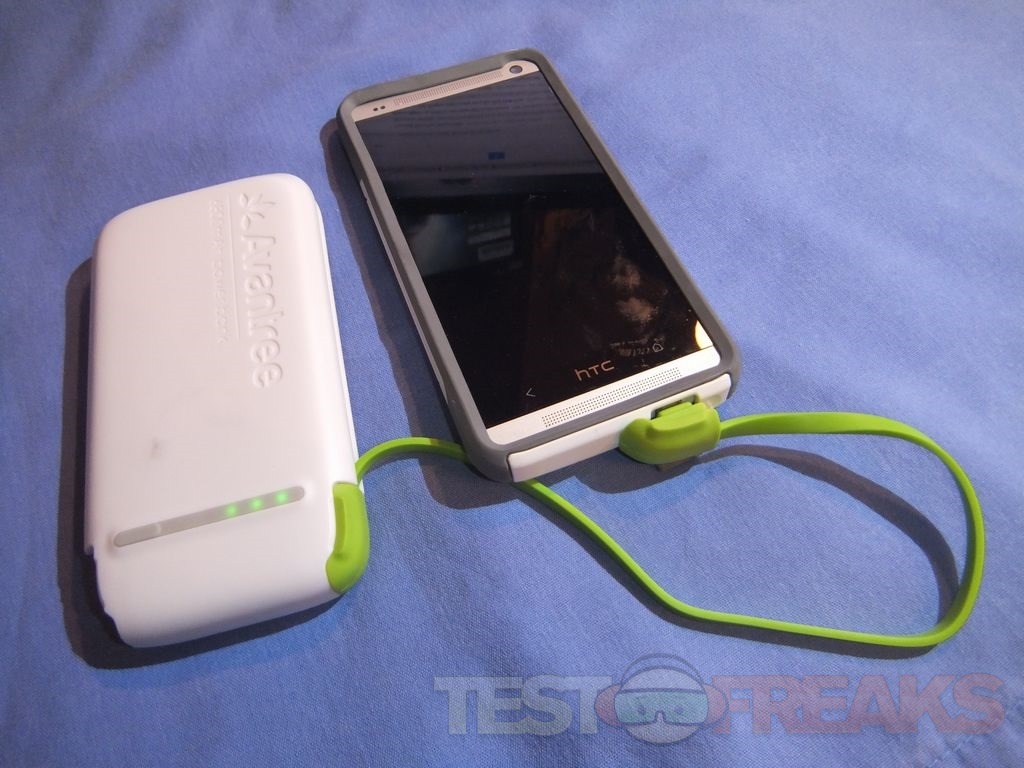 For testing I charged my HTC One Android phone first. To use the Juno you just need to plug in the USB cables and press the button to begin charging. Charging seemed just as fast as when I charged through the USB cable I have attached to my computer, not any slower and not really any faster that I could tell. The LEDs again will light up to indicate charging your device and then will go out as the battery in the Juno is discharged.