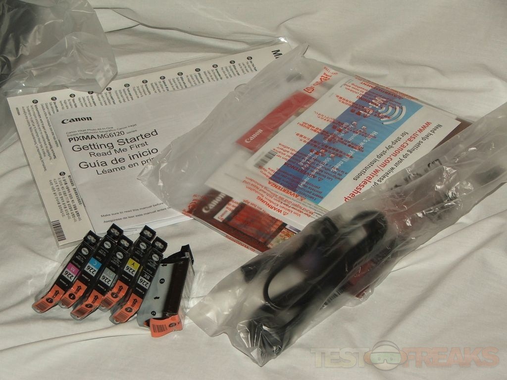 Included with the printer is quite a bit of documentation, some sample photo paper, a power cord, driver/software disc and six ink cartridges.