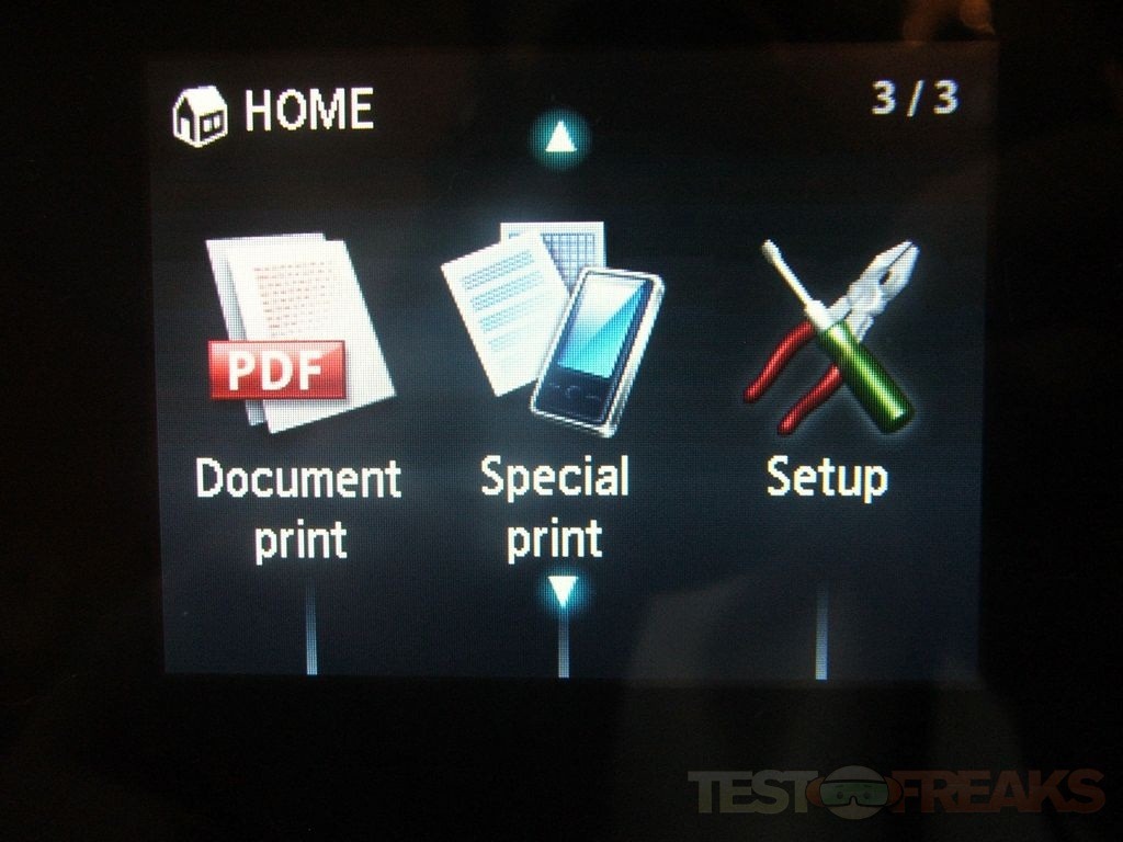 The top of the printer is the scanner cover, but it’s also the user interface with a 3” LCD panel that collapses flush with the lid.